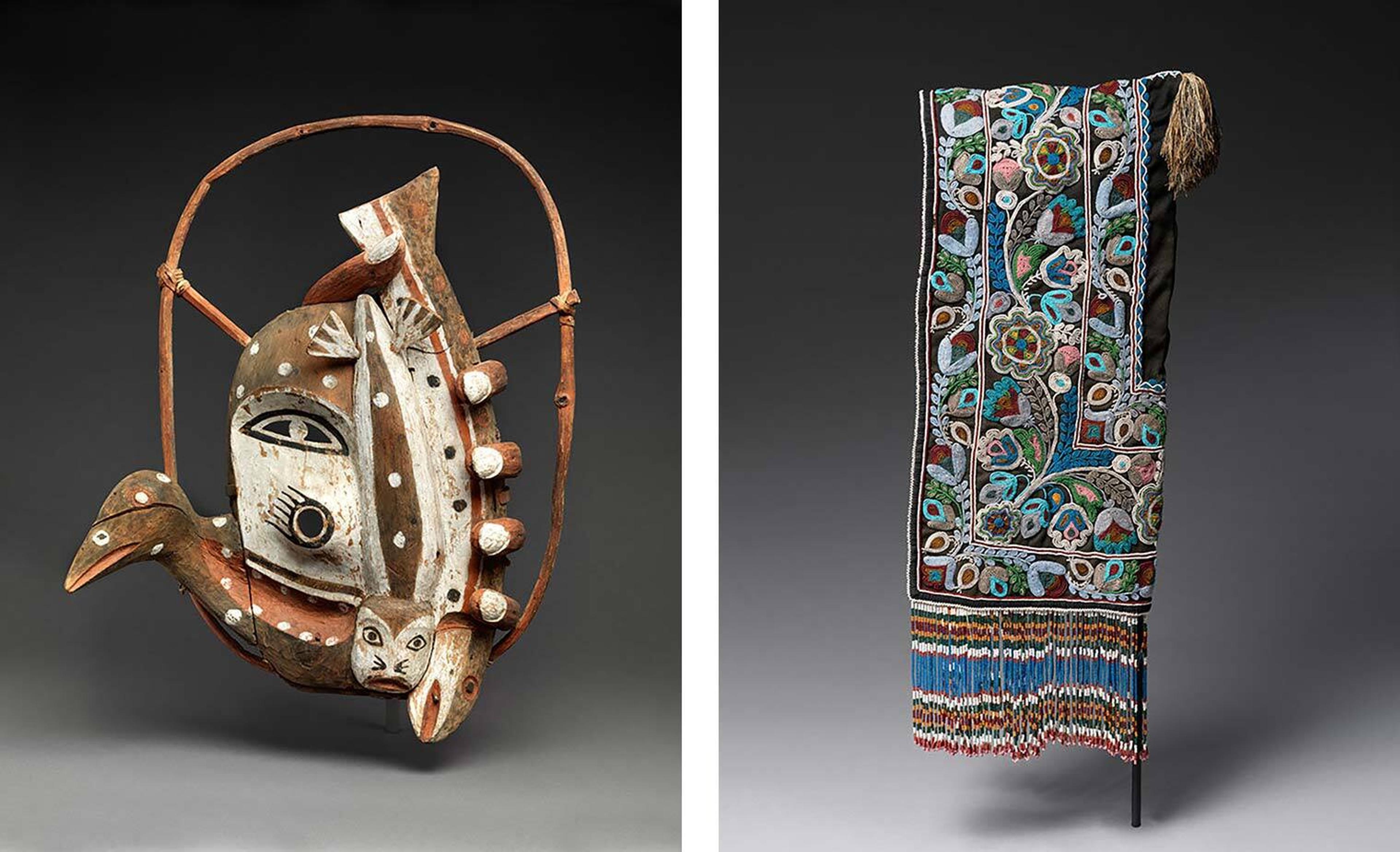 Left: Yup'ik artist. Dance mask. Alaska, ca. 1916–18. Wood, pigment, and vegetal fiber, 20 1/2 x 14 x 8 in. (52.1 x 35.6 x 20.3 cm). The Metropolitan Museum of Art, New York, The Charles and Valerie Diker Collection of Native American Art, Promised Gift of Charles and Valerie Diker. Right: James Bay Cree artist. Woman's hood. Quebec, Canada, ca. 1865. Wool cloth, glass beads, and silk thread, 26 3/4 x 10 in. (67.9 x 25.4 cm). Loan from the Charles and Valerie Diker Collection