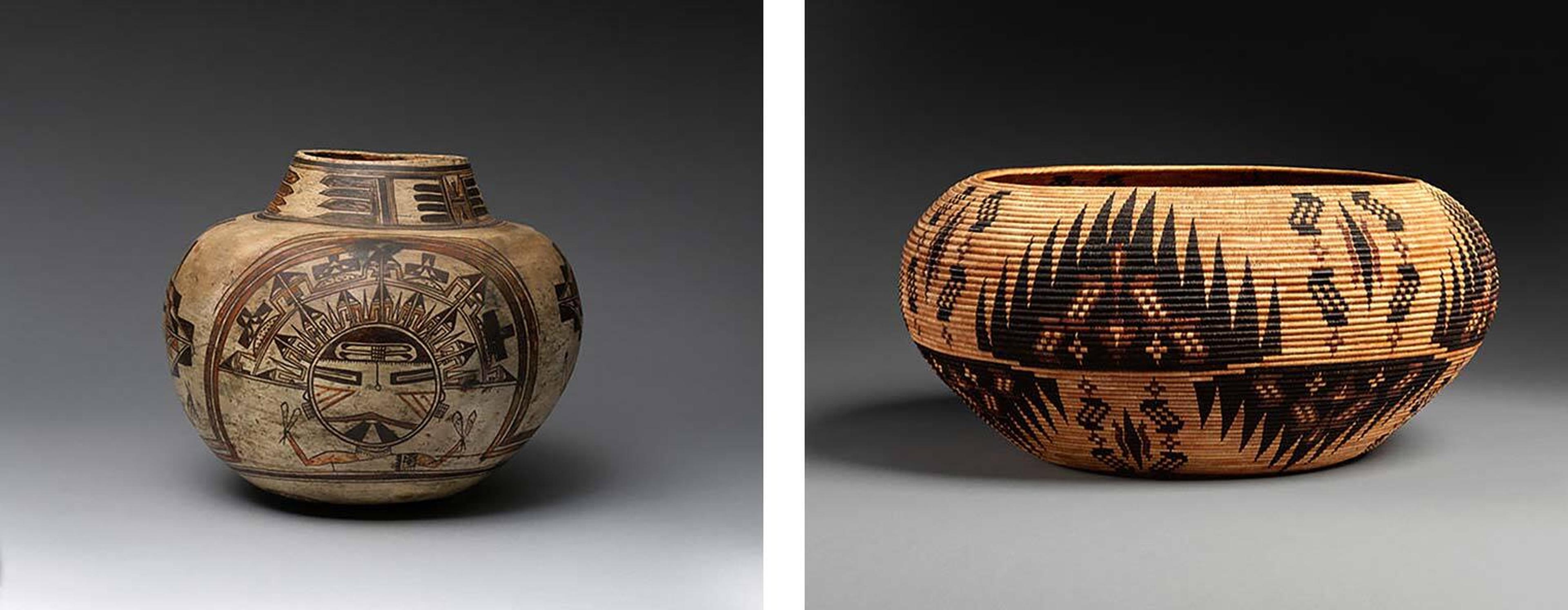 Left: Nampeyo (Hopi-Tewa, ca. 1859–1942). Polacca polychrome water jar. Arizona, ca. 1895–1900. Clay and pigment, 12 x 13 1/2 in. (30.5 x 34.3 cm). The Metropolitan Museum of Art, New York, The Charles and Valerie Diker Collection of Native American Art, Gift of Valerie-Charles Diker Fund, 2017 (2017.718.8). Right: Carrie Bethel (Mono Lake Paiute, 1898–1974). Basket bowl. Mono Lake, California, United States, 1929. Willow shoots, sedge root, redbud shoots, and dyed bracken root, 9 x 19 1/2 in. (22.9 x 49.5 cm). Loan from the Charles and Valerie Diker Collection. Image © Charles and Valerie Diker Collection/Photo: Dirk Bakker