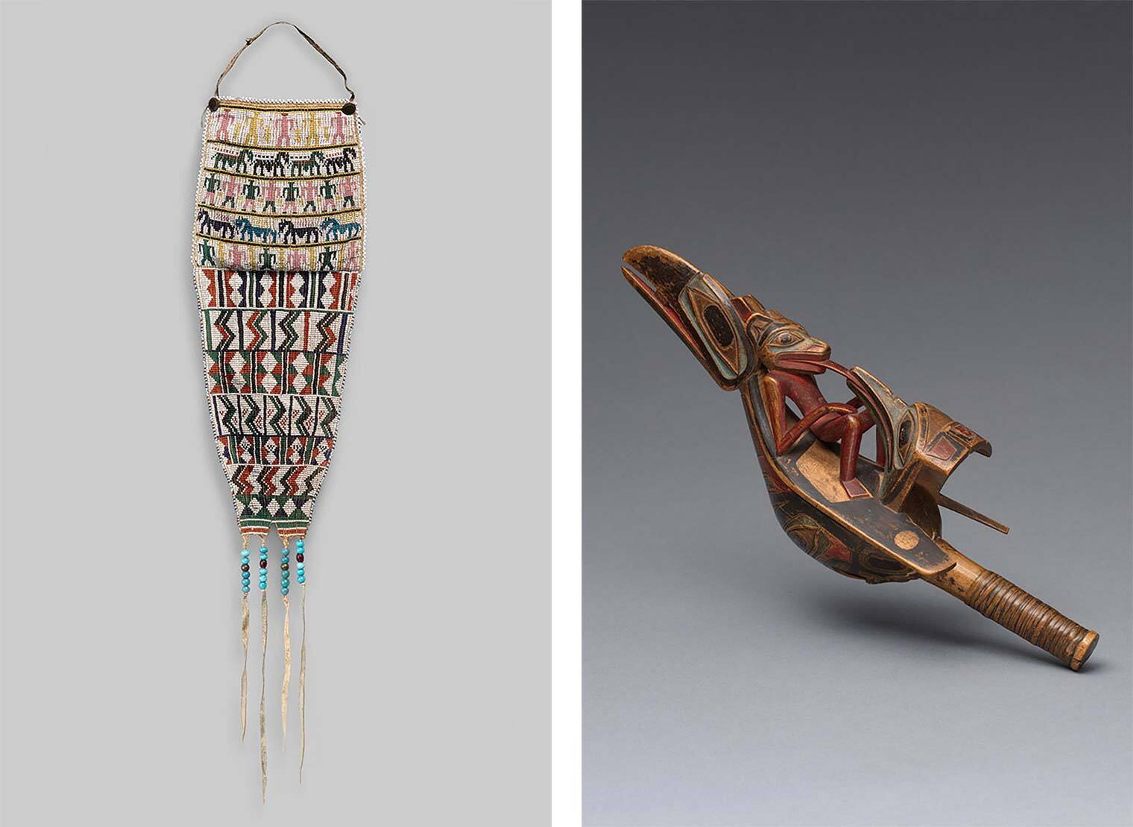 Left: Wasco artist. Bag. Oregon or Washington, United States, ca. 1860. Native-tanned leather, cordage, glass beads, brass beads, and commercial brass buttons, 28 x 6 3/4 in. (71.1 x 17.1 cm). The Metropolitan Museum of Art, New York, The Charles and Valerie Diker Collection of Native American Art, Promised Gift of Charles and Valerie Diker. Image © Charles and Valerie Diker Collection/Photo: Dirk Bakker. Right: Attributed to Albert Edward Edenshaw (Haida, 1812–1894). Raven rattle. British Columbia, Canada, ca. 1850. Wood, pigment, glass beads, and vegetal fiber, 4 3/4 x 13 3/8 x 3 9/16 in. (12 x 34 x 9 cm). The Metropolitan Museum of Art, New York, The Charles and Valerie Diker Collection of Native American Art, Promised Gift of Charles and Valerie Diker