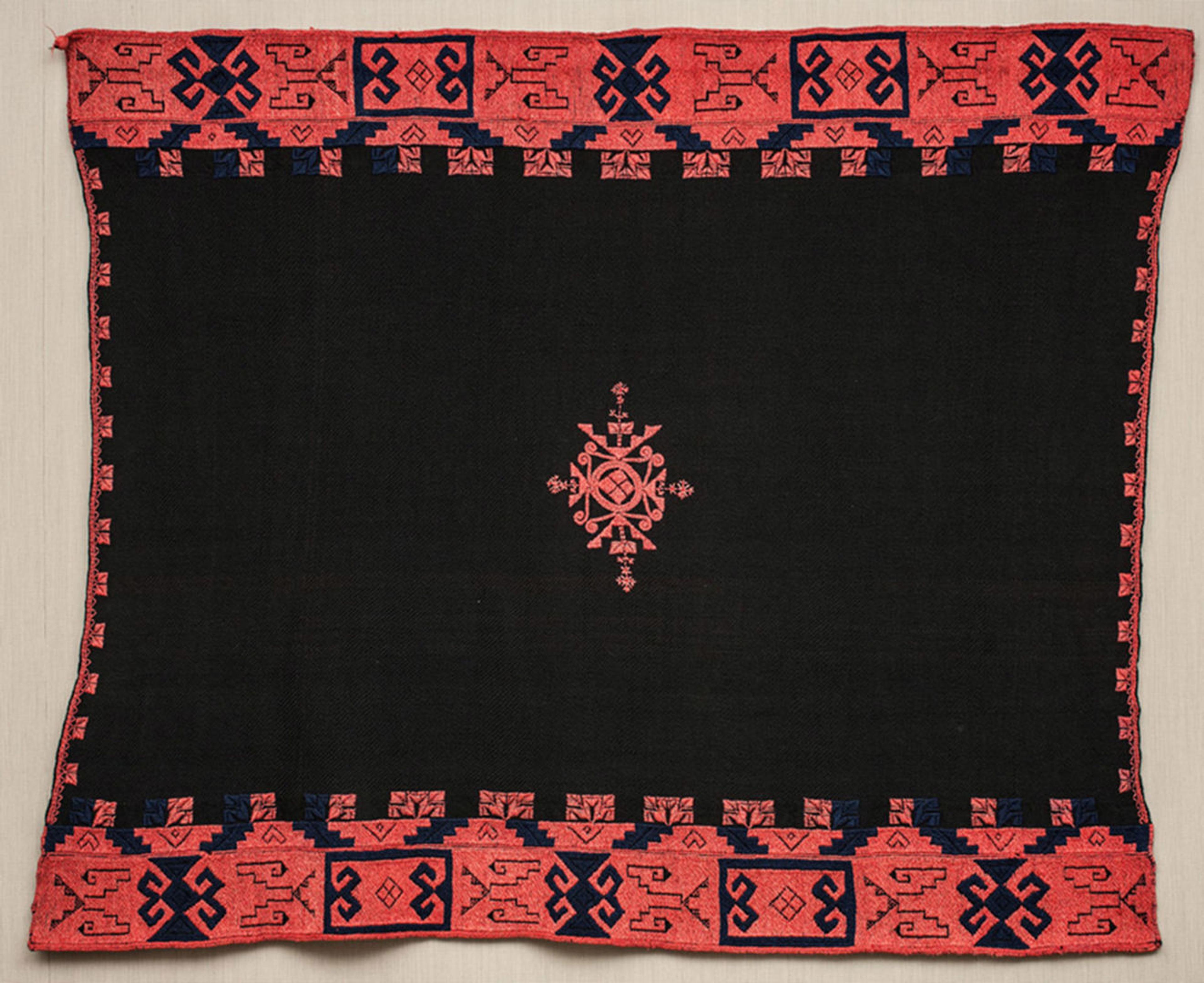 Acoma artist. Cape or dress. New Mexico, United States, ca. 1850. Handspun undyed and indigo-dyed Churro fleece and cochineal-dyed raveled bayeta, 48 x 58 in. (121.9 x 147.3 cm). The Metropolitan Museum of Art, New York, The Charles and Valerie Diker Collection of Native American Art, Promised Gift of Charles and Valerie Diker. Image © Charles and Valerie Diker Collection/Photo: Dirk Bakker