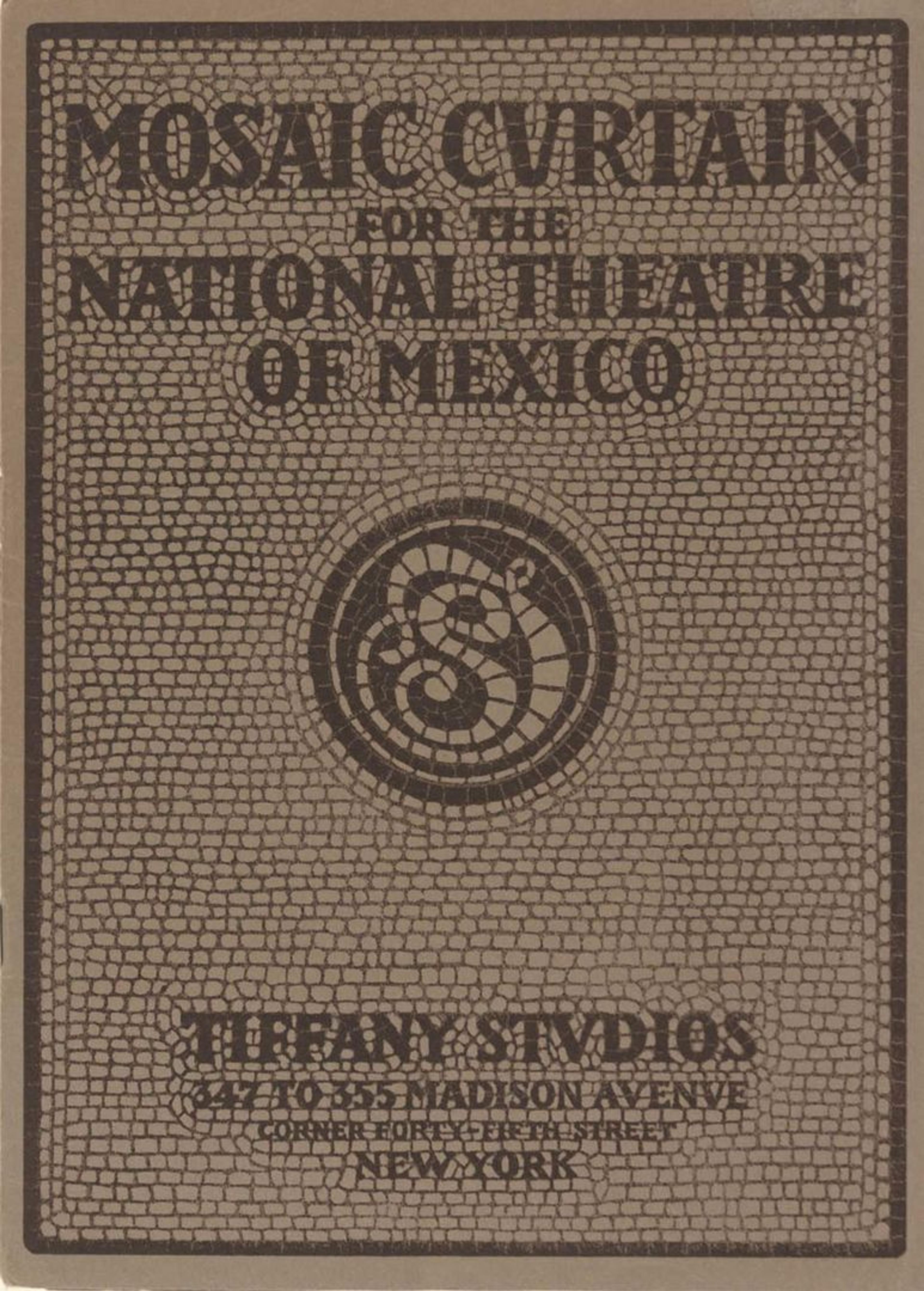 In 1911, Tiffany Studios published a pamphlet titled “Mosaic Curtain for the National Theater of Mexico City.” A mastermind of marketing and self-promotion, Louis Comfort Tiffany (1848–1933) distributed this booklet in New York City to publicize his latest tour de force, a resplendent mosaic stage curtain made entirely of Favrile glass for the Palacio de Bellas Artes in Mexico City. Work on the curtain started in 1909 and it was displayed in 1911 at the Tiffany Studios in New York with great success before being shipped to Mexico City. The Palacio de Bellas Artes, the crown jewel of President Porfirio Díaz’s dictatorship (1876–1911), had been under construction since 1904 and was meant to open in 1910 to celebrate the anniversary of Mexico’s independence. However, construction came to an abrupt halt around 1912, soon after the curtain was installed, due to the Mexican Revolution.