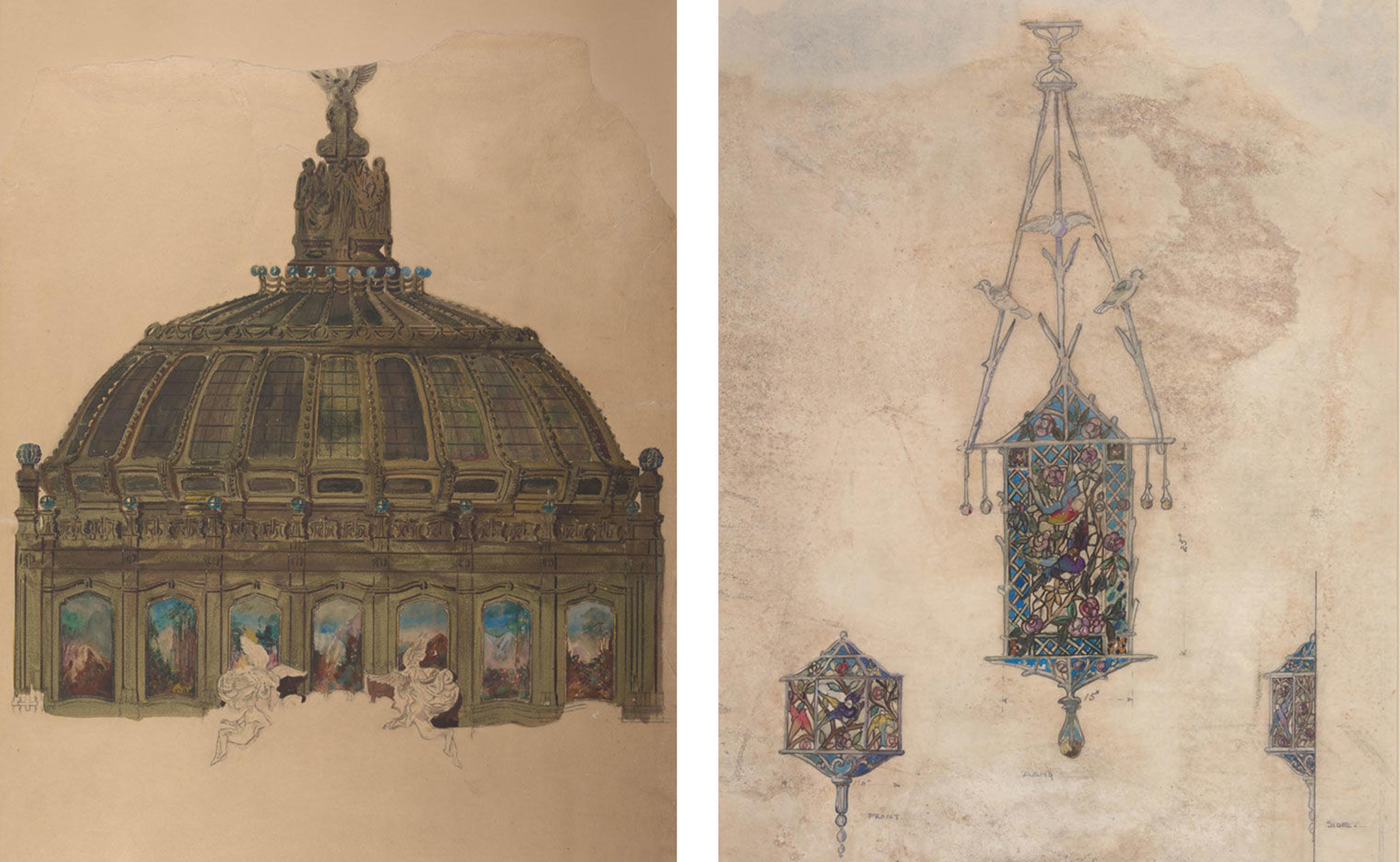 Left: Tiffany Studios, Design for the central dome of the Palacio de Bellas Artes in Mexico City, 1909–1912. The Metropolitan Museum of Art, 67.654.59. Right: Tiffany Studios, Design for fixtures for conservatory. Res of Mrs. Josefina de Mesa. Habana, Cuba, 1915–1916. The Metropolitan Museum of Art, 67.654.29