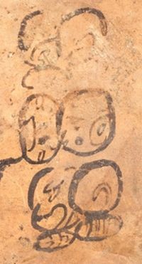 The second part of the date, 8 Zotz, records the month. The glyph is the head of a bat (zotz), identifiable by his leaflike nose.