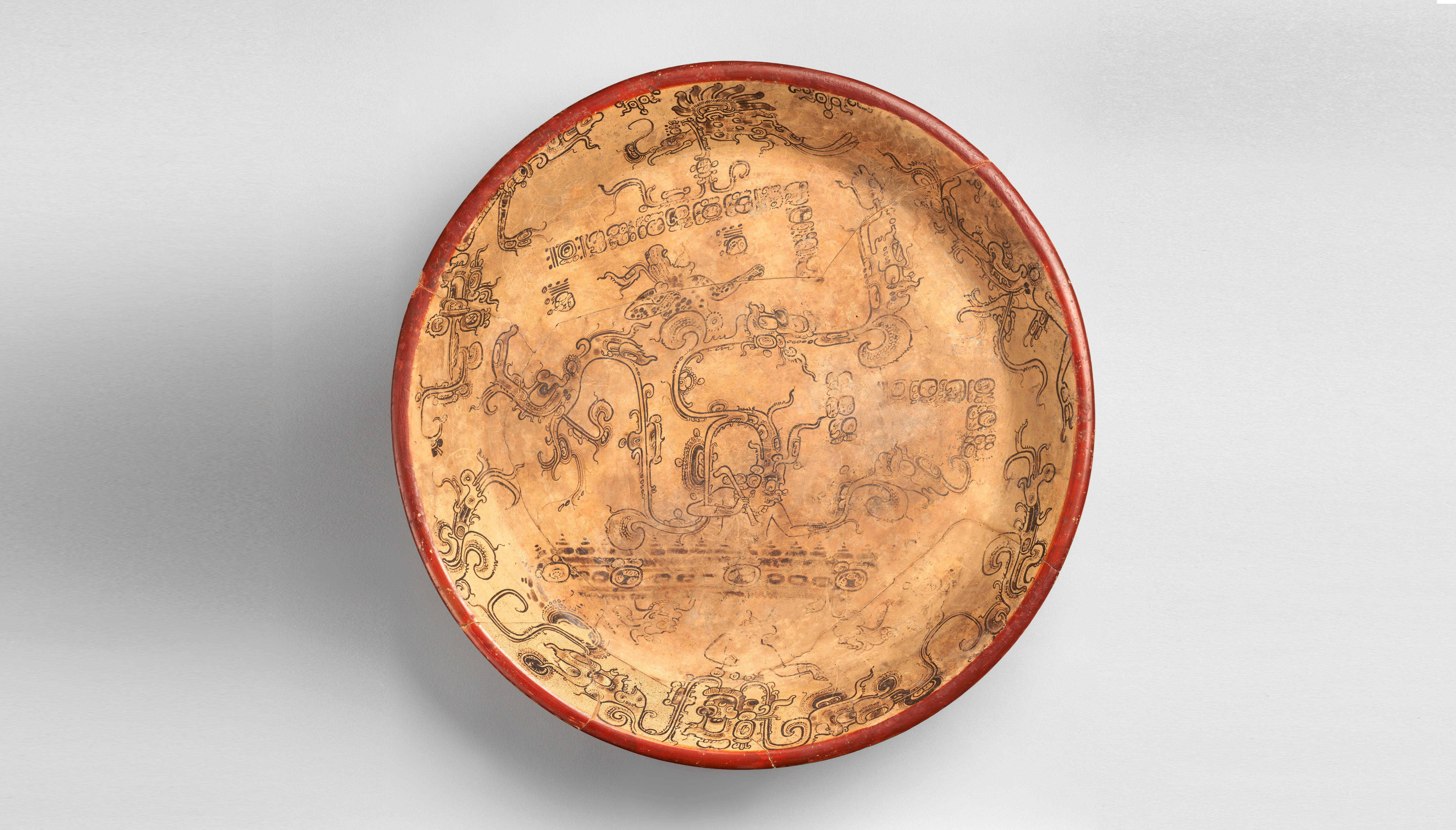 Tripod plate, mythological scene. 7th–8th century. Mexico or Guatemala. Maya. Ceramic with red, cream, and black slip. D: 16 1/2 in. (41.9 cm). The Metropolitan Museum of Art, New York, Gift of the Mol Collection, 2021 (2021.320)