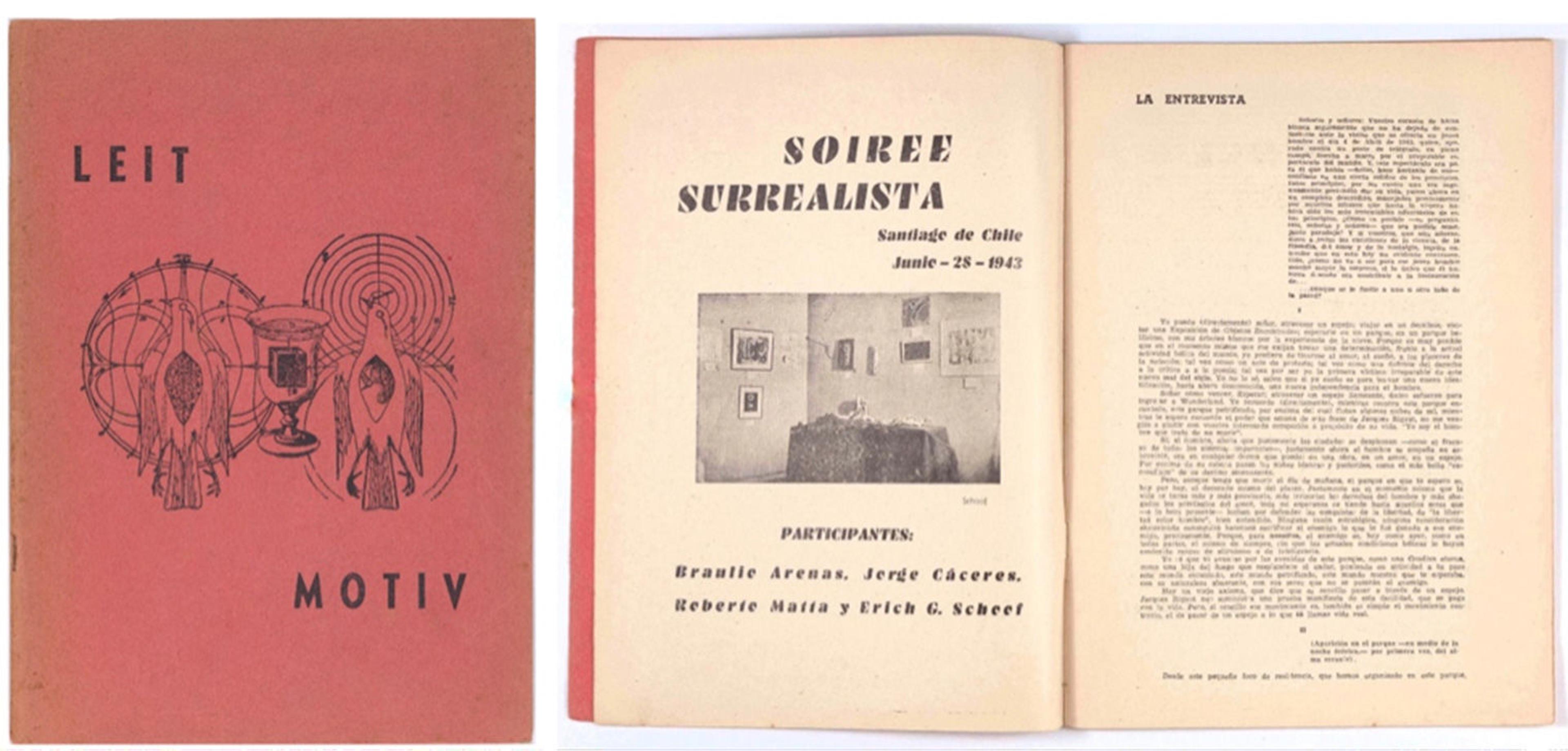 Leitmotiv: Boletin de hechos & ideas (1942–43) was a short-lived journal of two numbers, the first of which was published in Santiago, Chile, in December 1942. (A double and final issue was released in December of the following year.) A successor to Mandragora, Leitmotiv took a more global approach to Surrealism. The articles demonstrate Surrealism taking root in Chile and express the international nature of Surrealism through articles and notes on Surrealist themes and exhibitions in Europe and elsewhere. Each of the three issues contains a poem in French by Benjamin Péret. The first issue had a Portuguese translation of André Breton’s Prolegomena to a third manifesto surrealist or not (Prolegomenos a un tercer manifesto del Surrealism o no).