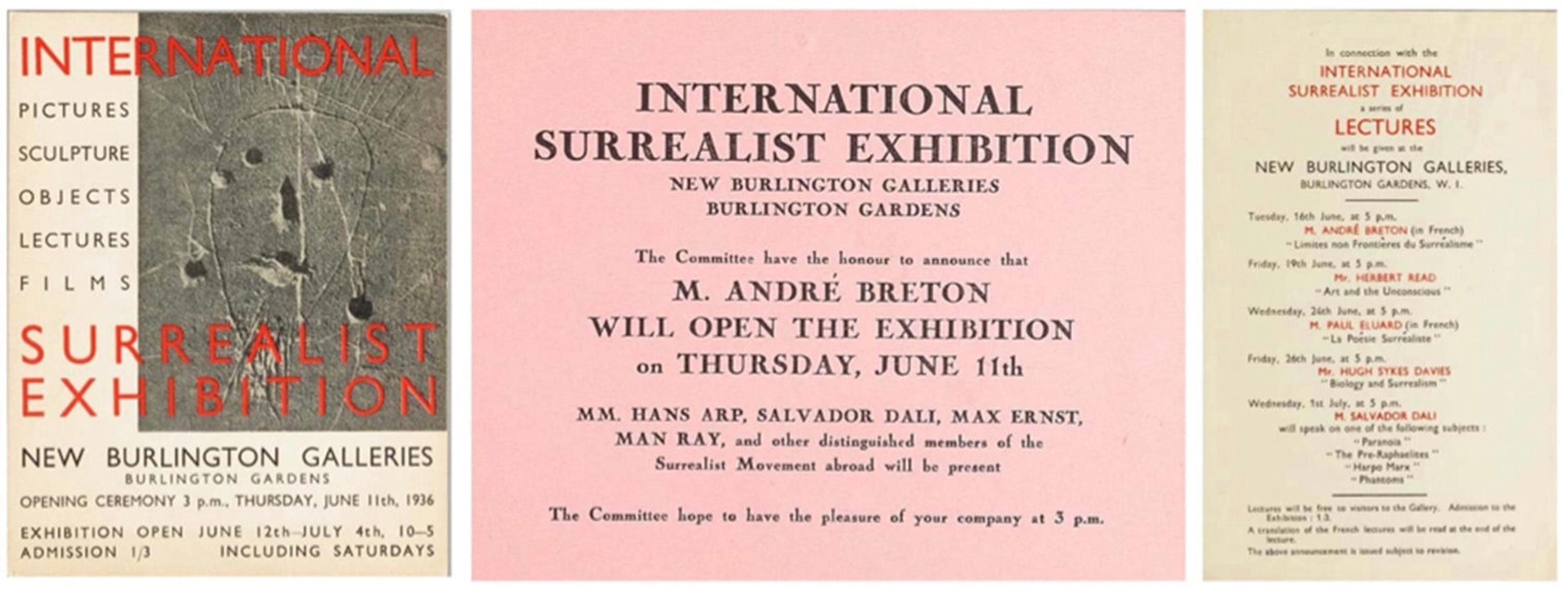 Exhibition announcement, invitation, and broadside to the International Surrealist Exhibition, New Burlington Galleries, 1936, Gift of Friends of the Thomas J. Watson Library