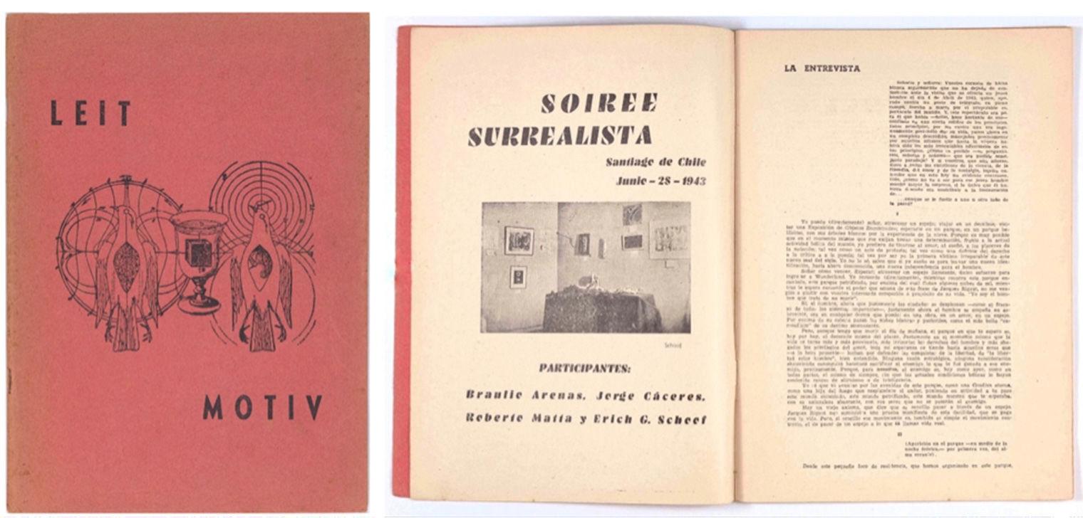 Leitmotiv: Boletin de hechos & ideas (1942–43) was a short-lived journal of two numbers, the first of which was published in Santiago, Chile, in December 1942. (A double and final issue was released in December of the following year.) A successor to Mandragora, Leitmotiv took a more global approach to Surrealism. The articles demonstrate Surrealism taking root in Chile and express the international nature of Surrealism through articles and notes on Surrealist themes and exhibitions in Europe and elsewhere. Each of the three issues contains a poem in French by Benjamin Péret. The first issue had a Portuguese translation of André Breton’s Prolegomena to a third manifesto surrealist or not (Prolegomenos a un tercer manifesto del Surrealism o no).