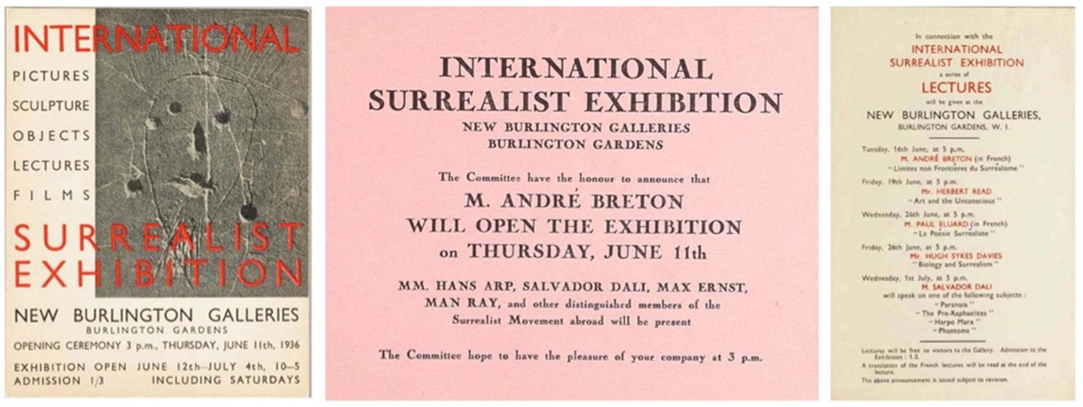 Exhibition announcement, invitation, and broadside to the International Surrealist Exhibition, New Burlington Galleries, 1936, Gift of Friends of the Thomas J. Watson Library