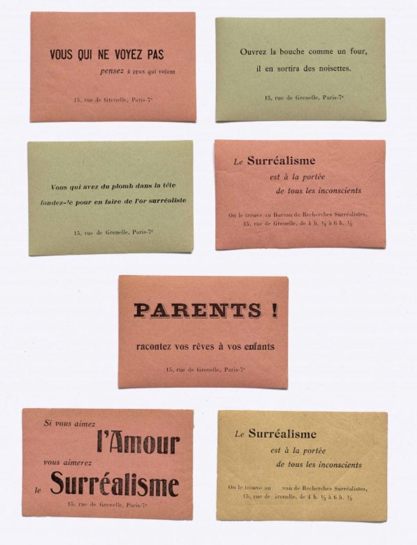 Similarly, small ephemeral leaflets, known as Papillons, circulated in 1924 and 1925. Created by Breton’s Bureau de Recherches Surréalistes (Bureau of Surrealist Research) in Paris, the small leaflets could easily attach to street posts or walls in a café. Each had a short message: Si vous aimez l’amour, vous aimerez le surréalisme (If you love, you will love Surrealism), for example, or: Vous qui avez du plomb dans la tête fondez-le pour en faire de l’or surréaliste (You who have lead in your head, melt it to create surrealist gold). Another reads Parents! Racontez vos rêves à vos enfants (Parents! Tell your children about your dreams).