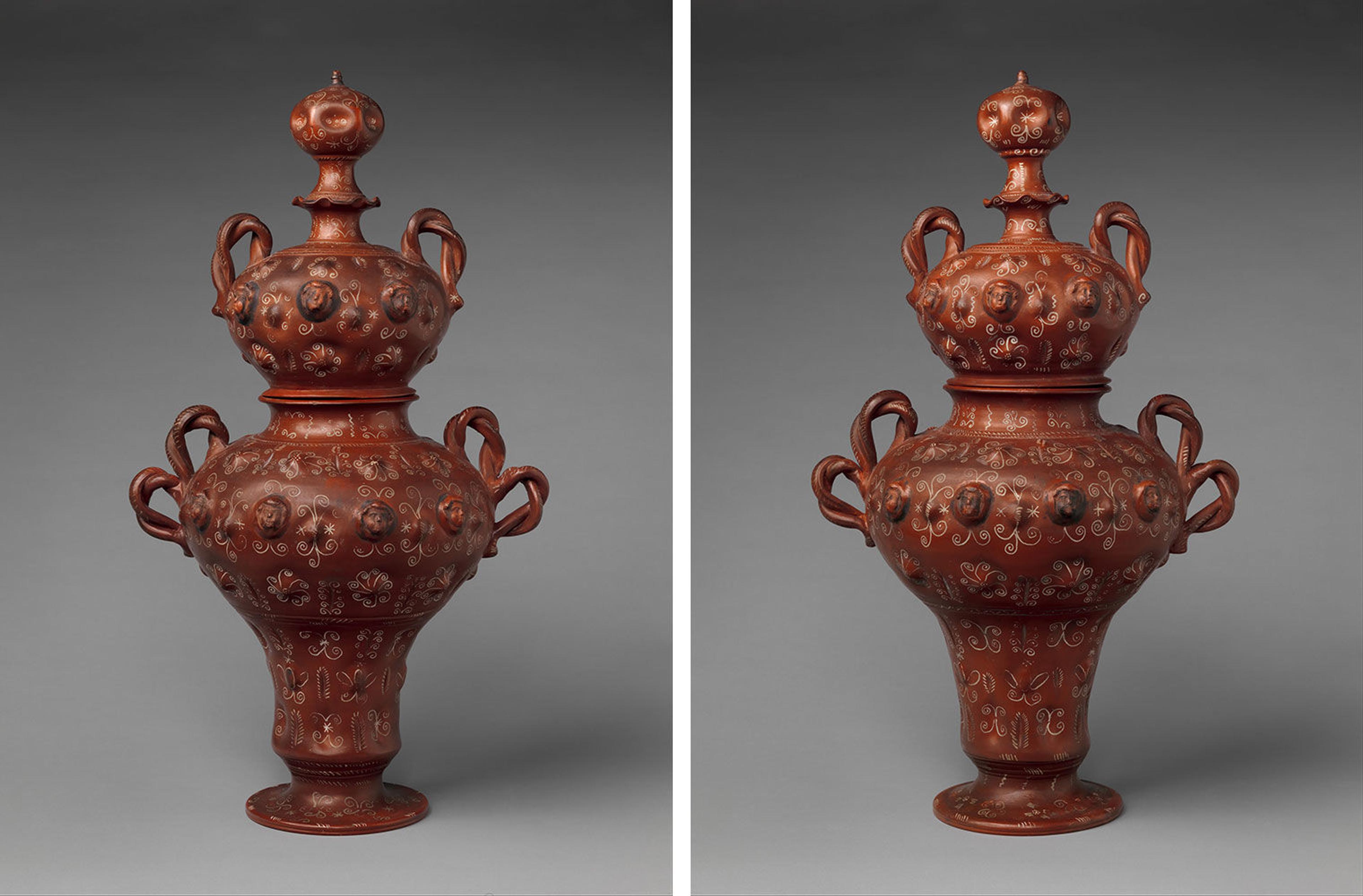 DUNGY: And then… there’s the búcaros. A búcaro is a type of clay vessel and The Met has two of them in its collection. They’re believed to have been made in Tonalá, Mexico in the late 1600s… still intact. Picture two red bulbous lidded vases, with spindly handles wound like vines. Made of impossibly thin clay, they’re so smooth they almost look lacquered. And tall… like, a little more than two feet tall. Totally extravagant.
