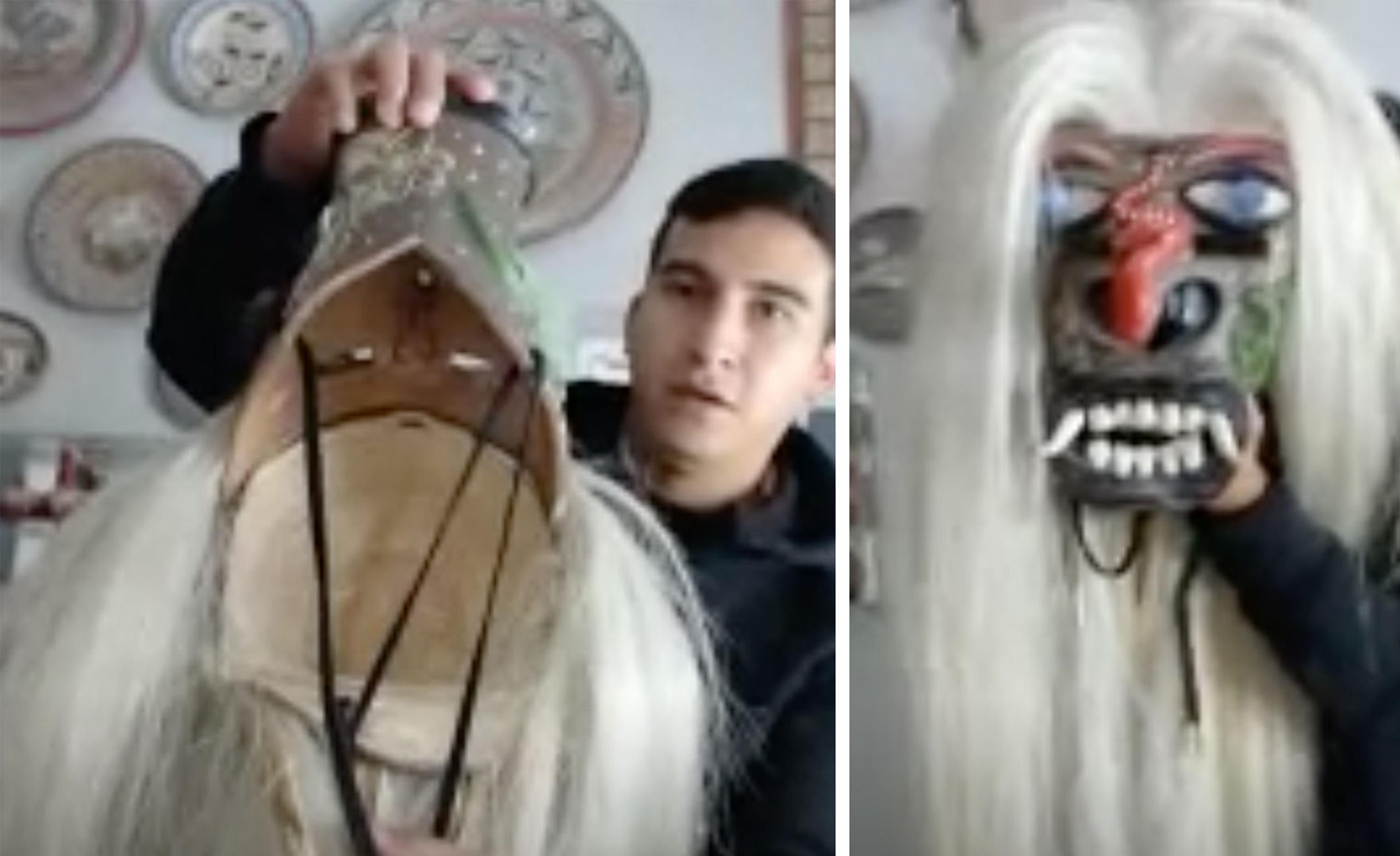 Fernando Jimón Melchor (the younger) showing a tastoana mask to the camera