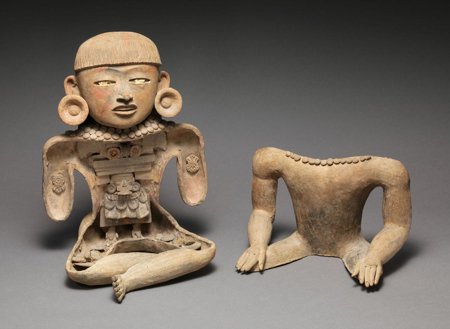 Teotihuacan-Style Hollow Figurine with Removable Chest Plate, Guatemala, 5th–7th century. Ceramic sculpture, pyrite, pigment, 14 3/4 × 10 3/4 × 10 1/4 in. (37.5 × 27.3 × 26 cm). Partial and Promised Gift of Linda M. Lindenbaum, from the Collection of Samuel H. and Linda M. Lindenbaum, 2015 (2015.226a, b). Courtesy of Samuel H. and Linda M. Lindenbaum.