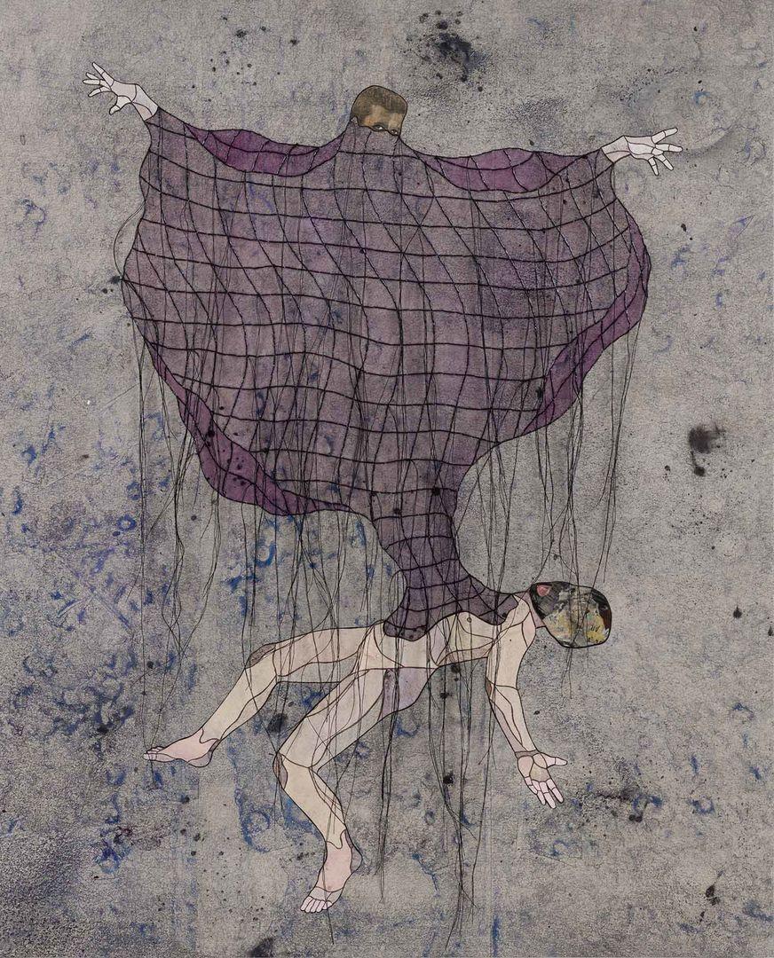 Felipe Baeza, Unrecognizable form,refusing to be governed, 2022. Ink, embroidery, acrylic, graphite, varnish, and cut paper on panel, 20 x 16 in. © Felipe Baeza. Courtesy Maureen Paley, London.