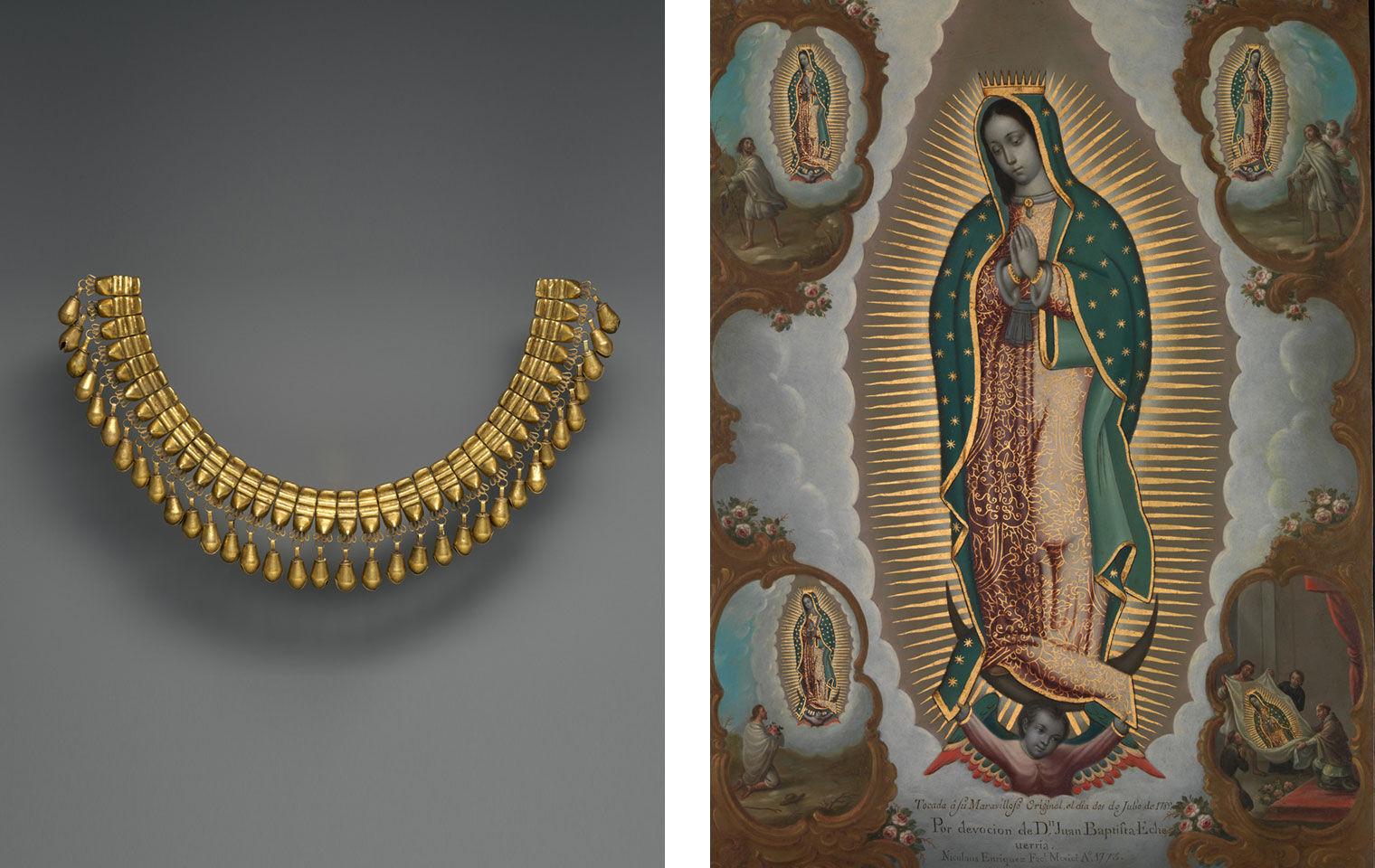 Two artworks featured in exhibitions at The Met, Golden Kingdoms: Luxury and Legacy in the Ancient Americas (left) and Painted in Mexico, 1700–1790: Pinxit Mexici (right). Left: Necklace with Beads in the Shape of Jaguar Teeth, 13th–16th century. Mixtec (Ñudzavui). Gold, H. 4 1/2 × W. 1 3/8 × D. 5 × L. 15 1/4 in. Purchase, Mariana and Ray Herrmann, Jill and Alan Rappaport, and Stephanie Bernheim Gifts, 2017 (2017.675), Right: Nicolás Enríquez (Mexican, 1704–1790). The Virgin of Guadalupe with the Four Apparitions, 1773. Oil on copper, 22 1/4 × 16 1/2 in. Purchase, Louis V. Bell, Harris Brisbane Dick, Fletcher, and Rogers Funds and Joseph Pulitzer Bequest and several members of The Chairman's Council Gifts, 2014 (2014.173)