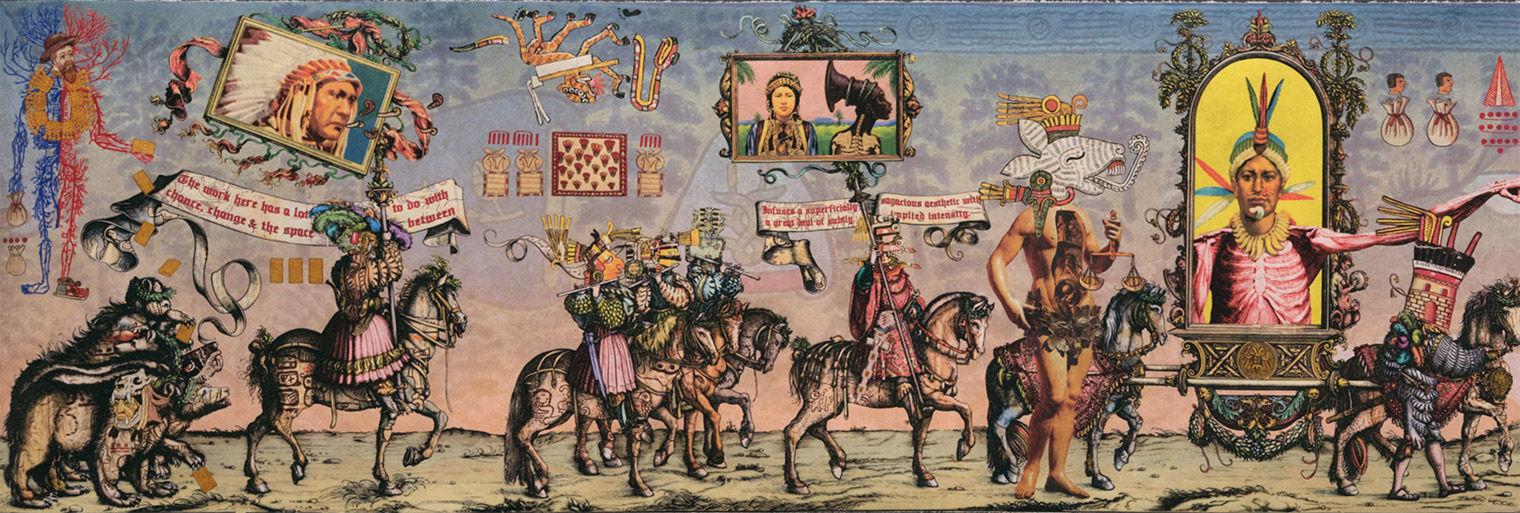 My recent codex/scroll The Waters of Oblivion in Mictlán (2021) is about greed and gold sought by the Spanish conquistadors in Mexico during colonial times. It is an acrylic digital print on handmade Mexican amate paper. In that work, I appropriate engravings that describe a procession celebrating The Triumph of Maximilian by Hans Burgkmair done in Austria around the times of the conquest of Mexico. The engravings were finished after the death of the emperor Maximillian in the early sixteenth century. The gold represented in the scroll and printed with gold leaf by hand—coins, gold bricks, and jewelry—refers to my work from an Aztec Codex painted after the conquest: The Codex Tepetlaoztoc (Codex Kingsborough), which depicts taxes paid by Indigenous people to the Spanish Crown. Additionally, pre-Columbian gold necklaces, and other gold ornaments at The Met’s pre-Columbian galleries, are certainly connected to the use of gold in my codices.
