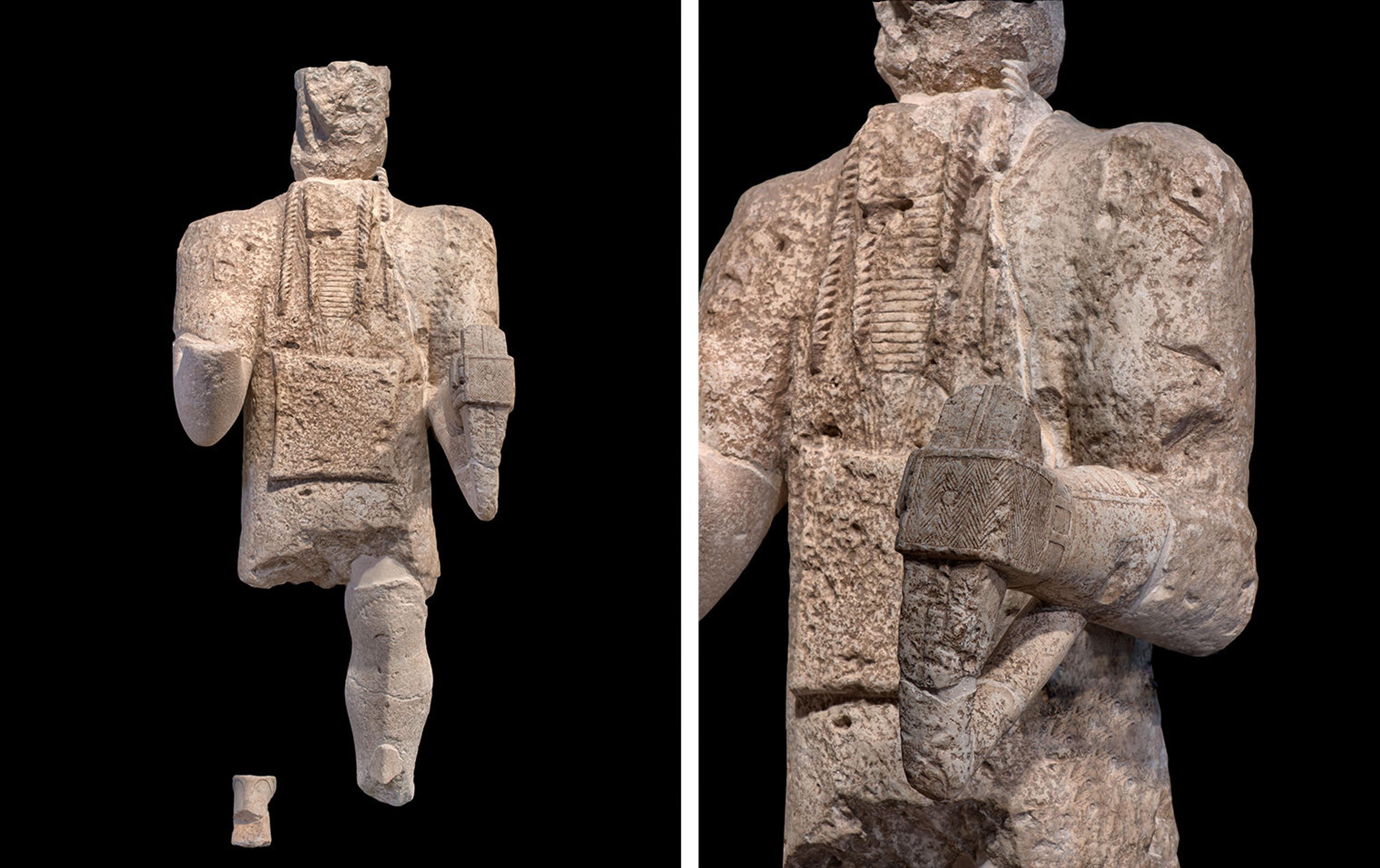 Left: Limestone statue of the archer Prexiau, from the necropolis at Mont’e Prama, 900–750 BCE. Sardinian, Nuragic. Limestone. Right: Detail of Prexiau’s bow. All images courtesy Mont’e Prama Foundation Archives, photos by Nicola Castangia