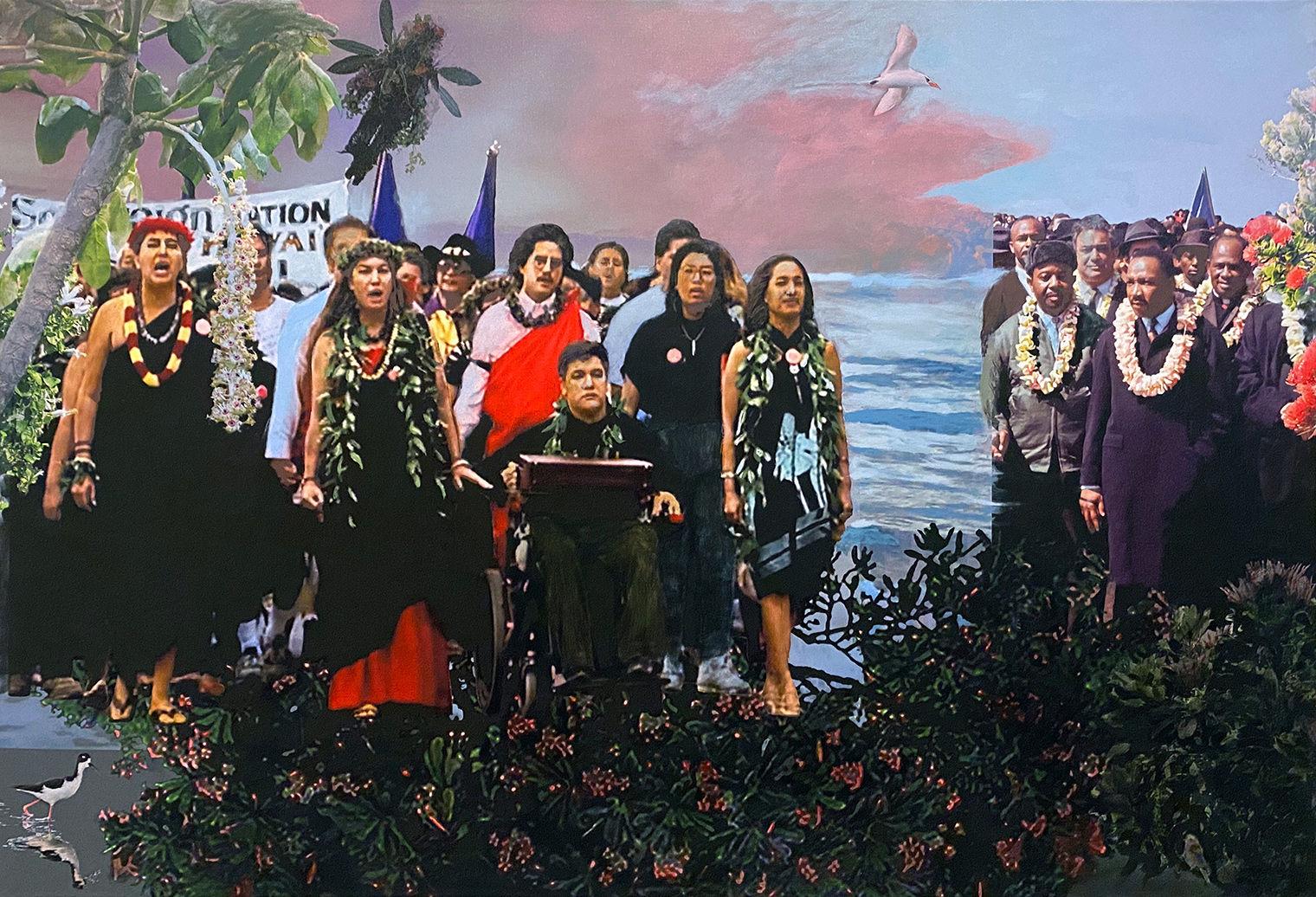The middle painting in the triptych pays homage to the Kanaka Maoli Native Hawaiian movement. On the left, you see the leaders of the Hawaiian movement of the ’70s to the ’90s: Lilikalā Kame'eleihiwa, the historian of the Great Mahele and translator of Hawaiian chants; the Hawaiian poet Haunani-Kay Trask. On the right, you see Martin Luther King. King went to seminary with the Hawaiian minister Reverend Akaka. Reverend Akaka invited King to Hawaiʻi to speak about the African-American movement against racism. Likewise, Reverend Akaka sent a Hawaiian delegation to some of the Alabama Selma marches in the ’60s. You see King wearing Hawaiian lei because of this very close connection to the Hawaiian movement.