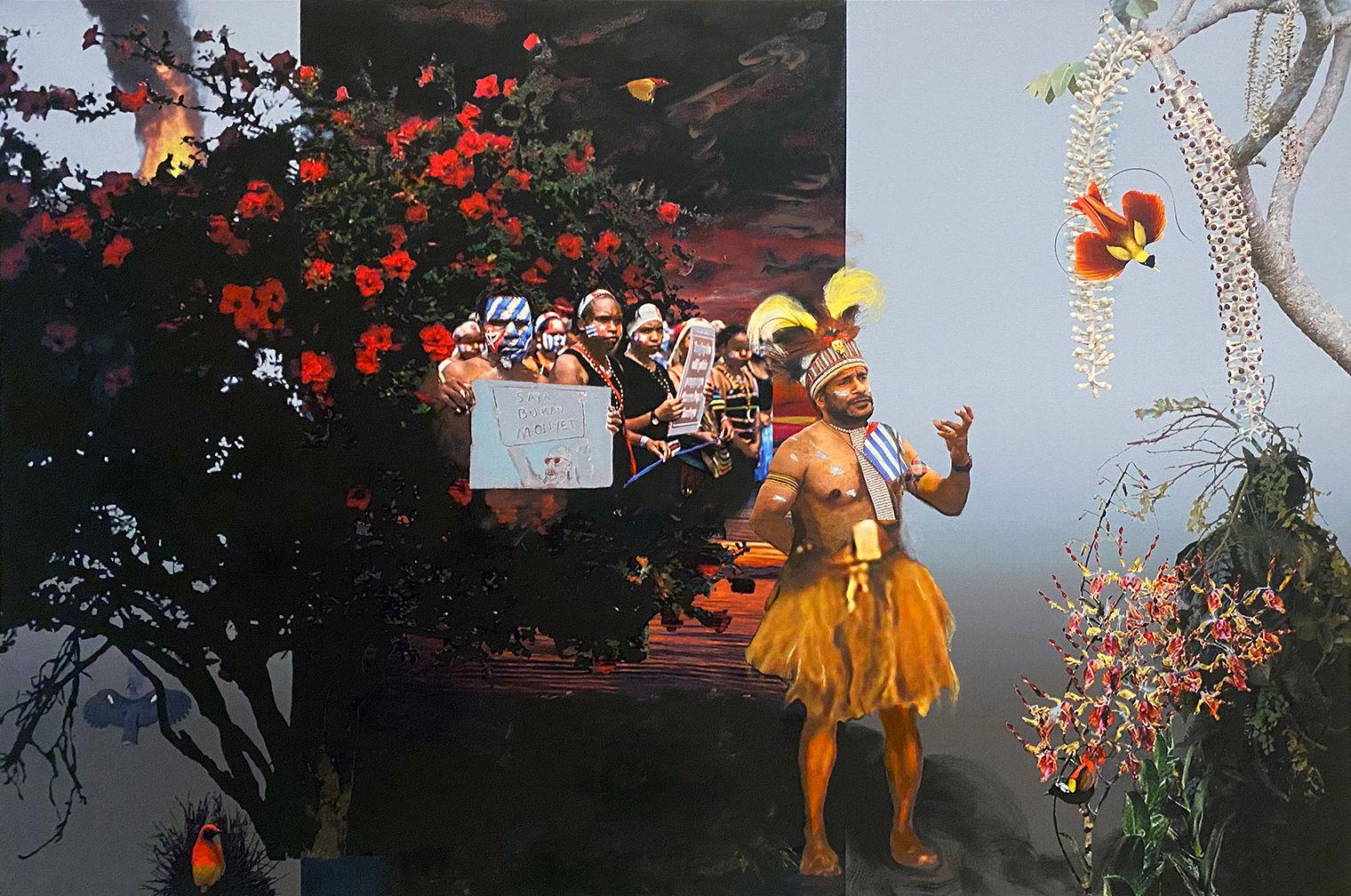 The first painting in the triptych is an homage to West Papua. In it, I’ve depicted Benny Wenda, the exiled leader of the West Papua Independence Movement. His family was murdered when he was a child and they had to flee West Papua when Indonesia took over. To his left is the figure of Victor Yeimo, who was immediately imprisoned by the Indonesian military when he held up this sign during a protest. In English, it says, “I am not a monkey.” A leader of the Indonesian government called the West Papuans monkeys and used this term to justify their murder.