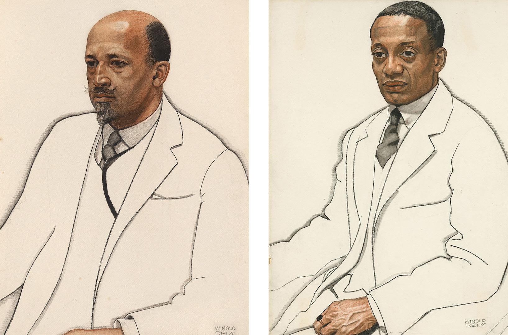 Left: Winold Reiss (American, born Germany, 1886–1953), W. E. B. Du Bois, 1925. Pastel on illustration paper, 30 x 21 5/8 in. (76 x 55 cm). National Portrait Gallery, Smithsonian Institution, Washington, D.C.; Purchase funded by Lawrence A. Fleischman and Howard Garfinkle with a matching grant from the National Endowment for the Arts (72.79); Right: Winold Reiss (American, born Germany, 1886–1953), Alain Leroy Locke, 1925. Pastel on illustration board, 29 7/8 x 21 5/8 in. (75.9 x 54.9 cm). National Portrait Gallery, Smithsonian Institution, Washington, D. C.; Purchase funded by Lawrence A. Fleischman and Howard Garfinkle with a matching grant from the National Endowment for the Arts (72.84)