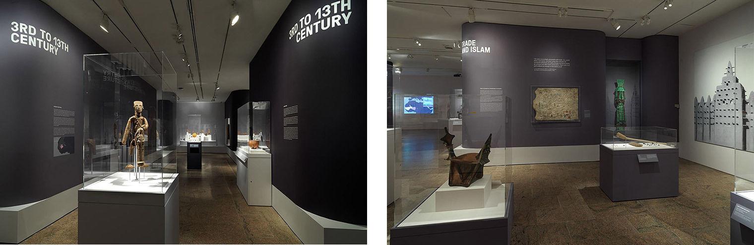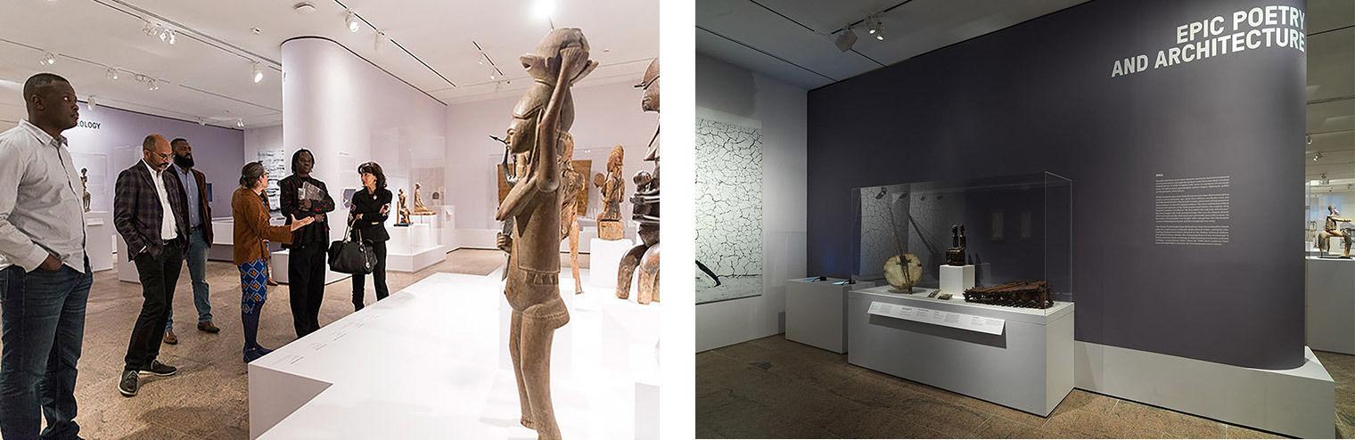 Left: Curator Alisa LaGamma leads a tour through the Sahel exhibition. Photo by Rebecca Schear. Right: Installation view of Sahel
