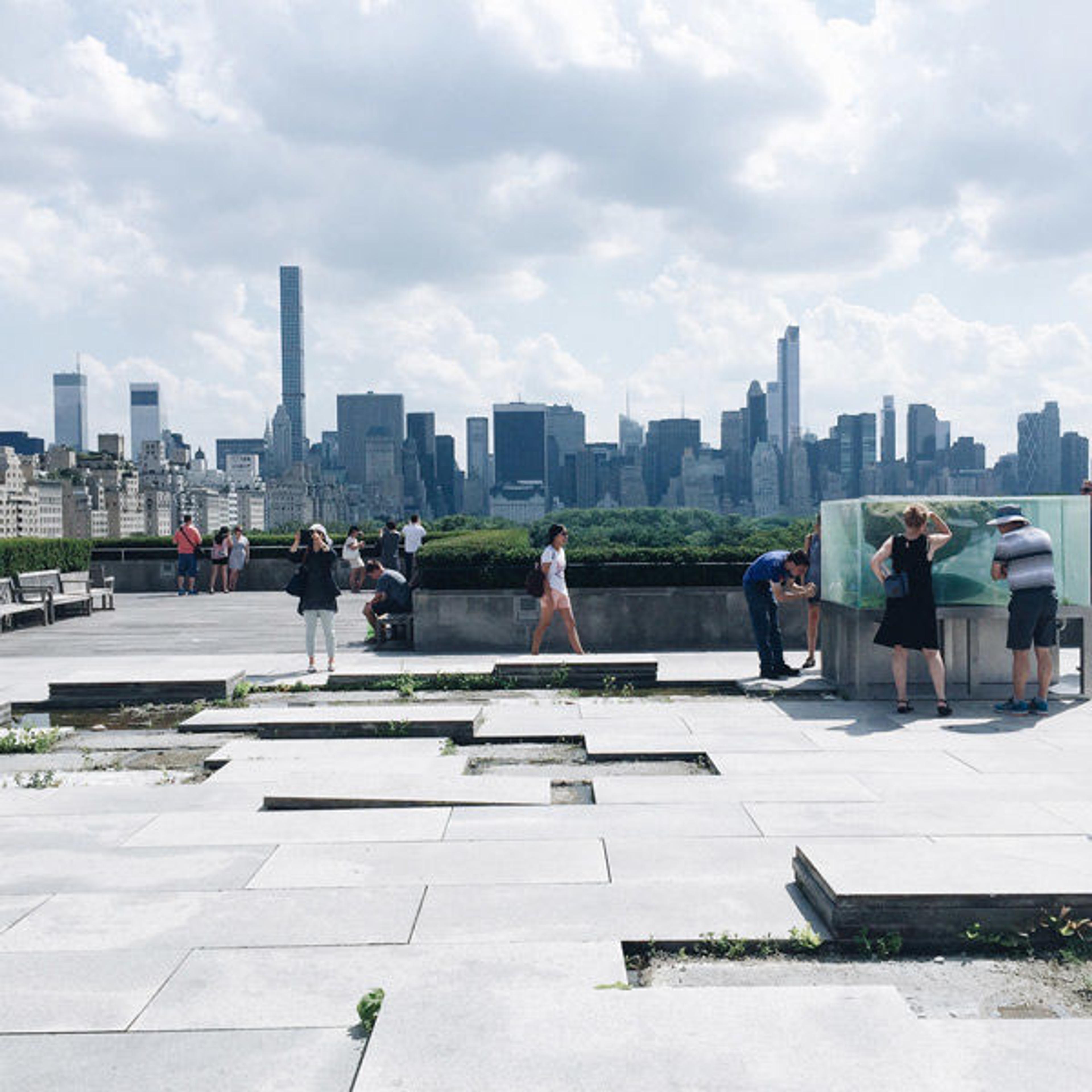Visitors' bodies mimic the New York City skyline as they view the exhibition The Roof Garden Commission: Pierre Huyghe