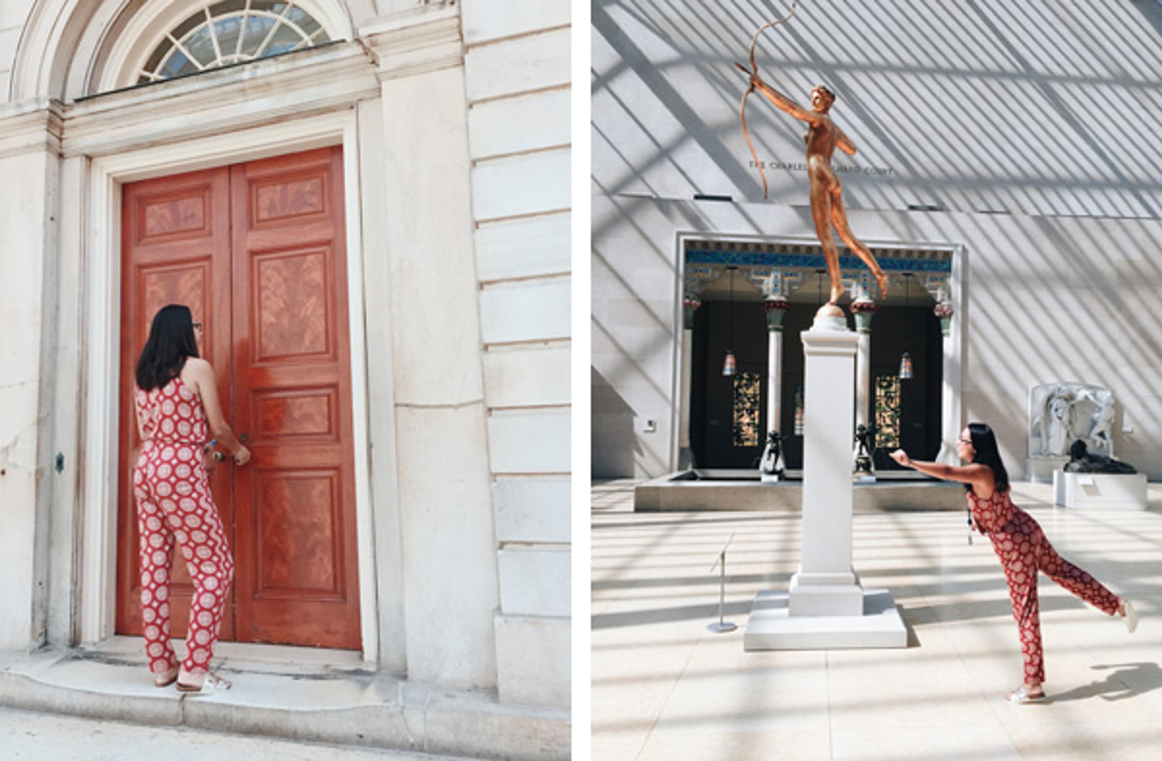 Left: Coordinating colors with the doors of the Branch Bank Facade in The Charles Engelhard Court. Right: Former High School Intern Ariana posing with Augustus Saint-Gaudens's Diana