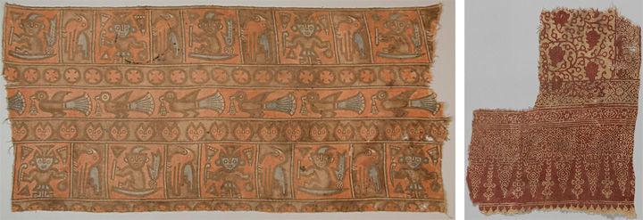 Left: Panel, 1100–1400. Peru. Cotton, paint; H x W: 27 1/8 x 59 1/2 in. (68.9 x 151.1 cm). The Metropolitan Museum of Art, New York, The Michael C. Rockefeller Memorial Collection, Bequest of Nelson A. Rockefeller, 1979 (1979.206.459). Right: Fragment, 13th–14th century. India. Cotton; block-printed and resist-dyed; 11.75 in. high 9.75 in. wide (29.8 cm high 24.8 cm wide). The Metropolitan Museum of Art, New York, Purchase, V. Everit Macy Gift, 1930 (30.112.32)