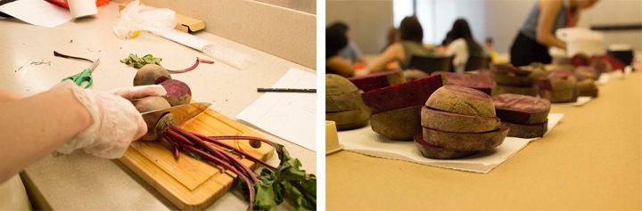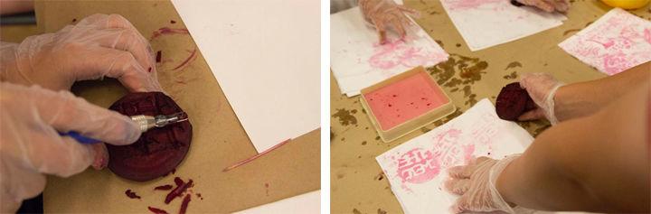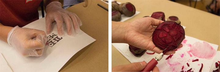 Left: Parker carving his design into the beet. Right: Parker printing his beet design onto a piece of fabric. Photos by Skyla Choi