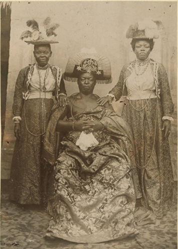 Portrait of Ovonramwen and wives, Queen Egbe (left) and Queen Aighobahi (right) in exile in Calabar, 1897–1913. Photograph. The National Archives United Kingdom. Image via Wikimedia Commons
