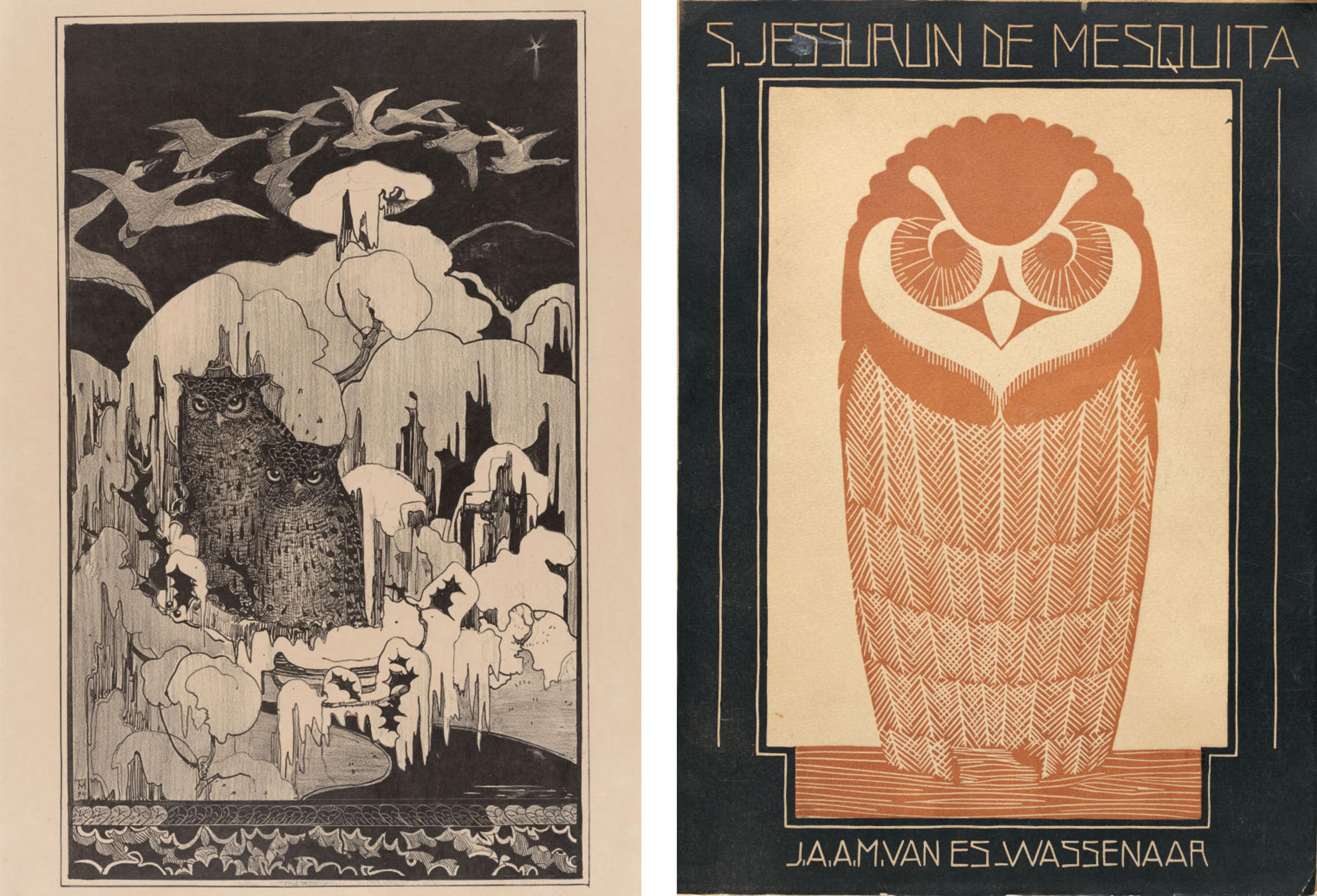 In the late nineteenth and early twentieth century, a tendency toward abstraction led to the development of new vocabularies and heralded the arrival of style periods known today as Art Nouveau and Art Deco. The designs of the Dutch artists Theo van Hoytema and Samuel de Mesquita show the progressive stages of this process of abstraction. The two owls at the center of Hoytema’s lithograph, Christmas Eve (1894), still appear as in nature, but below, he has incorporated a subtle decorative border with a row of abstracted owls in white and black. The cover illustration of a 1928 book dedicated to Mesquita’s art reduces the characteristics of the owl to several effectively placed color blocks and hatchings, which manage to evoke the nature of the animal without going into much detail.