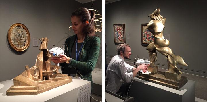 Left: Fellow Brunella Santarelli taking an X-ray fluorescence reading of Development of a Bottle in Space. Right: Associate Research Scientist Frederico Carò taking an X-ray fluorescence reading of Unique Forms of Continuity in Space. Photos courtesy of the author
