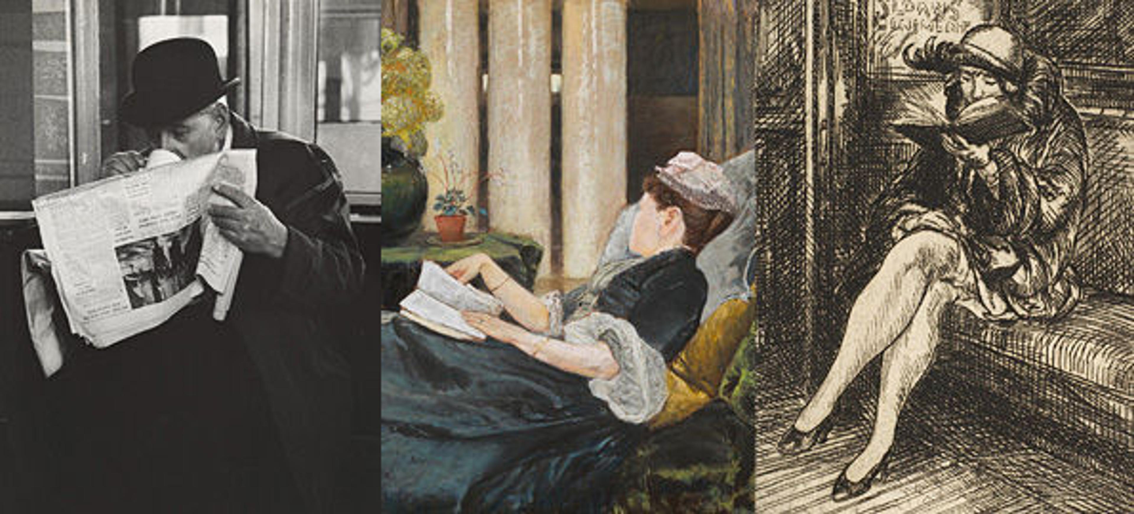 Above, from left to right: Leon Levinstein (American, 1910–1988). [Man in Bowler Hat Reading Newspaper and Drinking Tea, London] (detail), 1960s. Gift of Gary Davis, 2008 (2008.664.10), © Howard Greenberg Gallery; Louis Comfort Tiffany (American, 1848–1933). Louise Tiffany, Reading (detail), 1888. Gift of the family of Dorothy Tiffany Burlingham, 2003 (2003.606); John Sloan (American, 1871–1951). Reading in the Subway, (detail) 1926. Gift of Mrs. Harry Payne Whitney, 1926 (26.30.159)