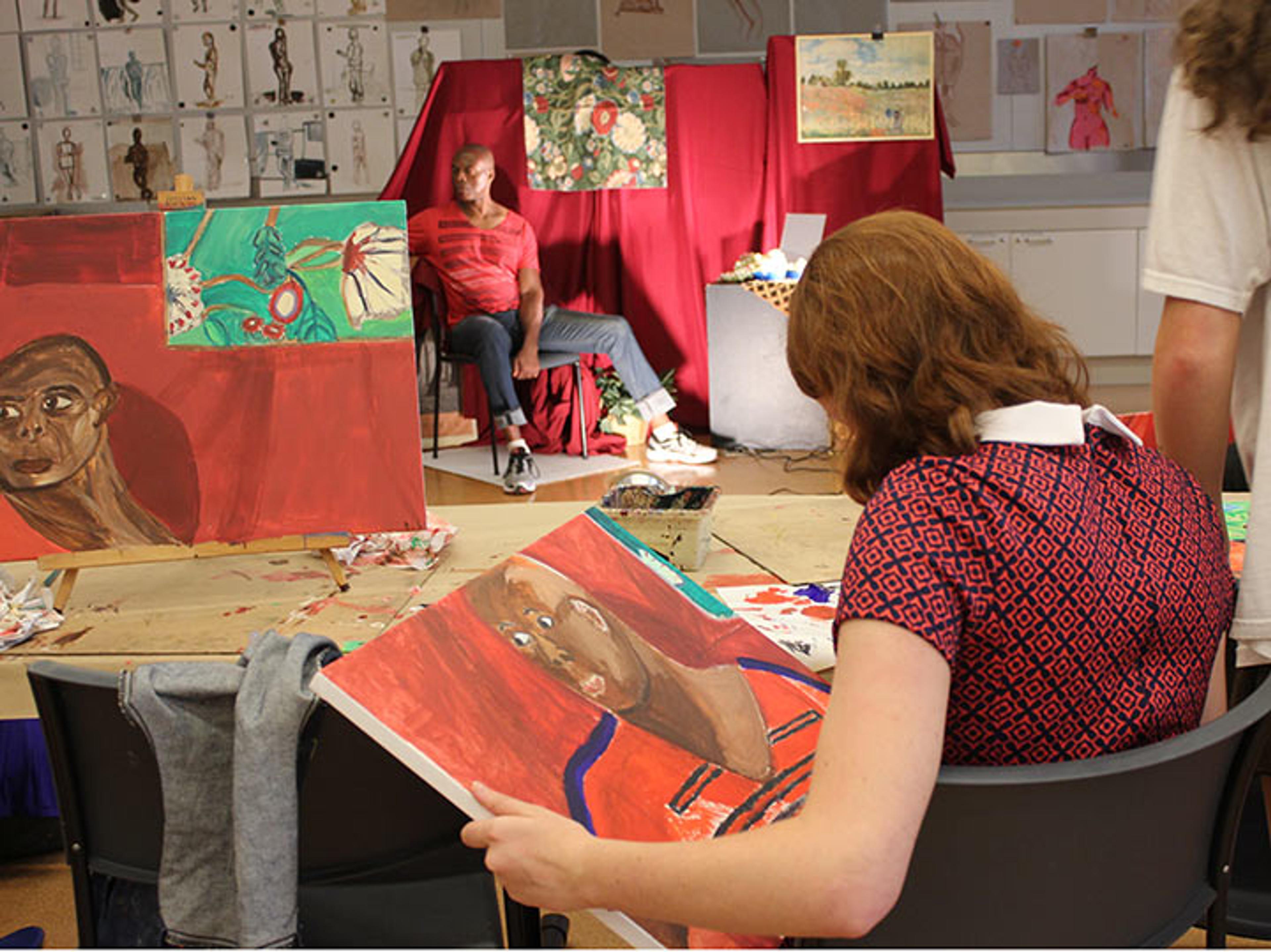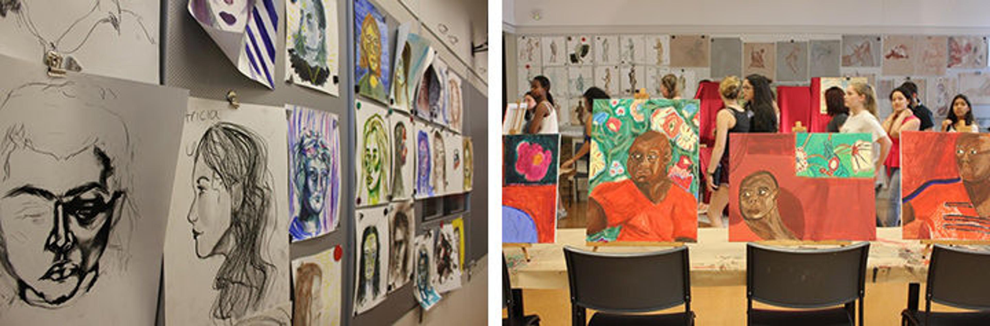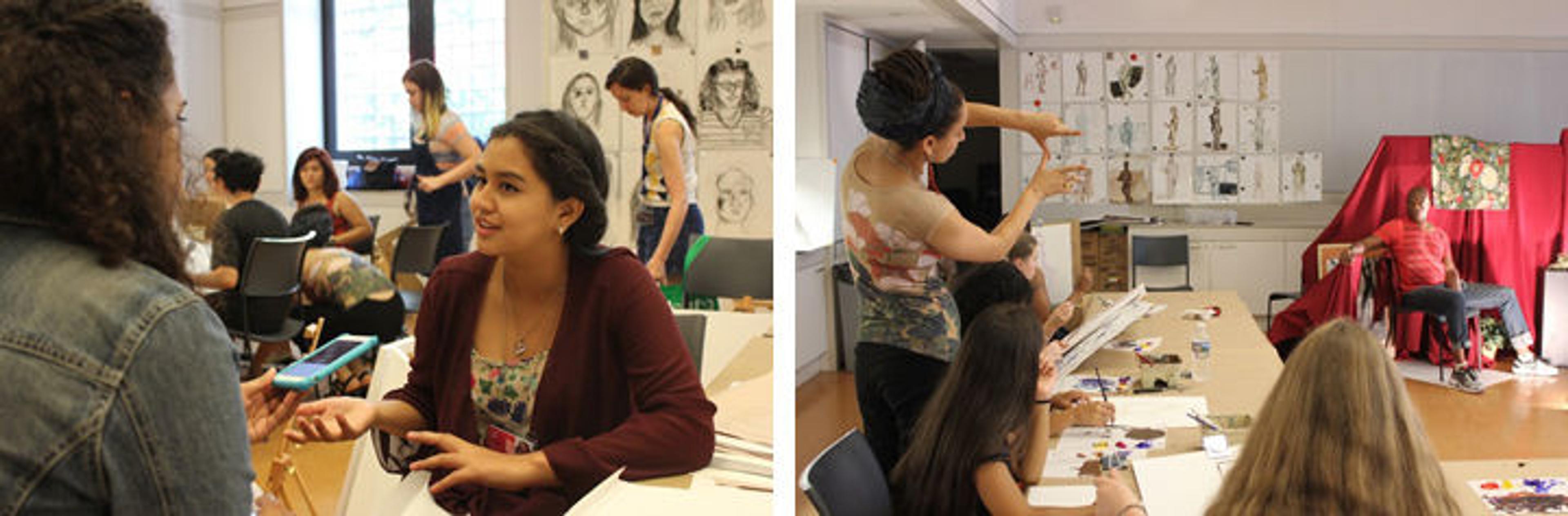 Left: By studying The Met collection, teens learned techniques for drawing self-portraits and portraits of each other. Photo by Megan Tyrer. Right: A wide array of styles emerged as students painted a live model in the studio. Photo by Ariel Greene