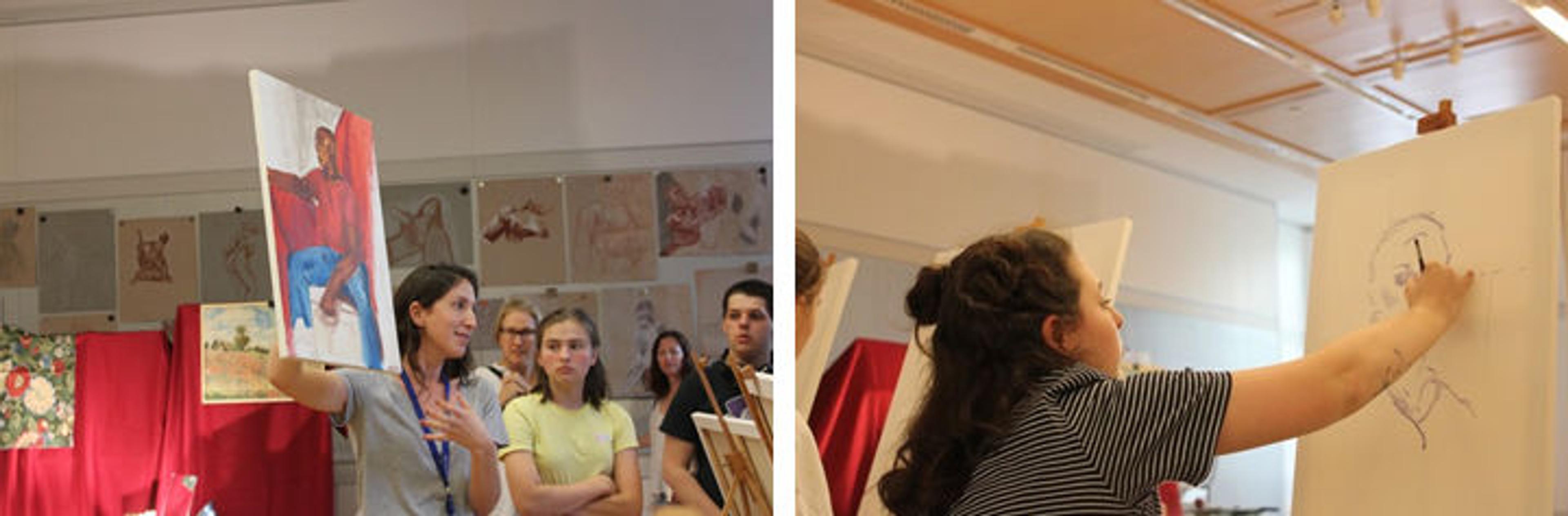 Left: Teaching artist Jaqueline Cedar leads a group critique of students' work on the final day; parents were also invited to observe. Right: Student Eden sketches her composition as she studies a live model. Photos by Ariel Greene