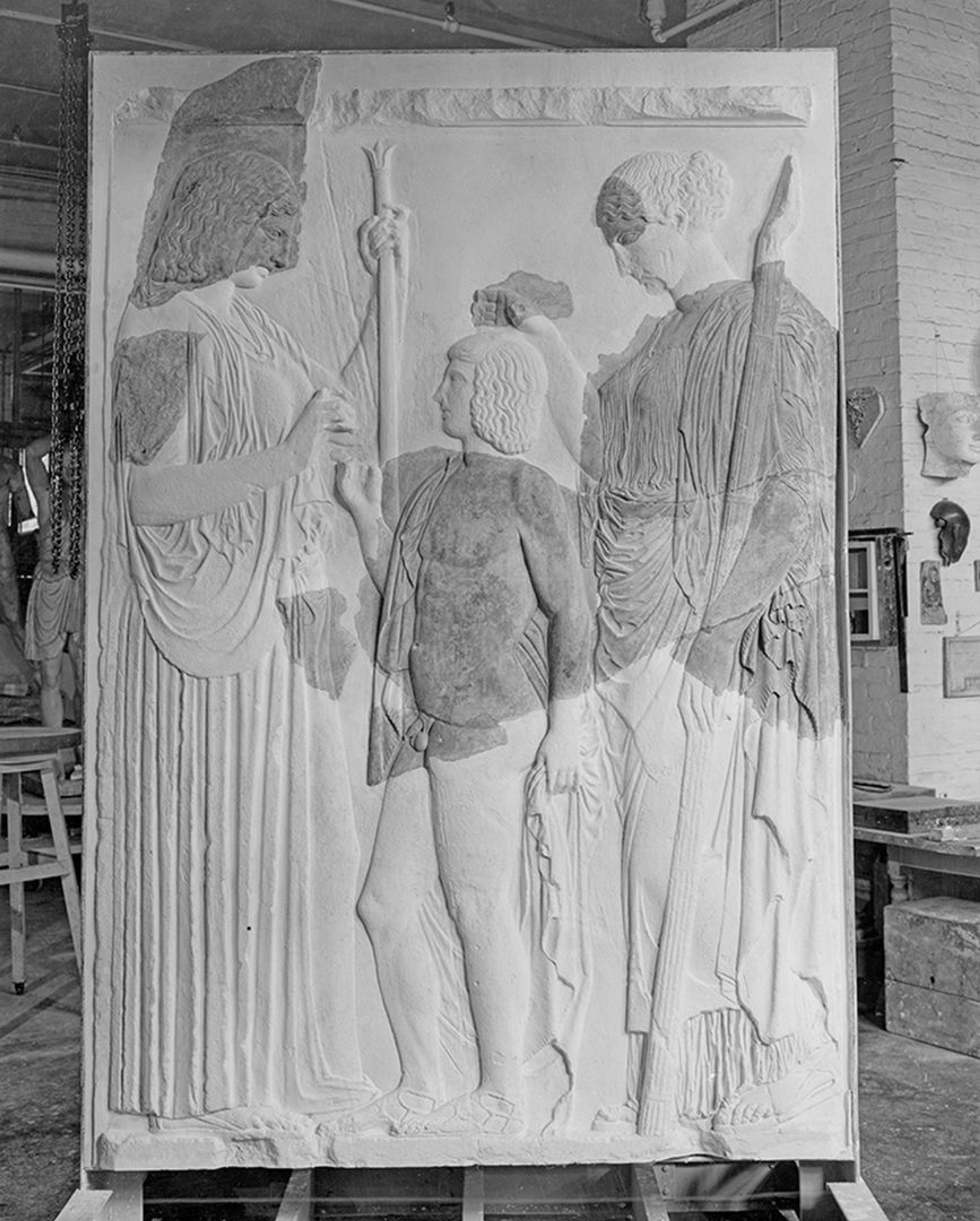 Archival photograph from May 1935 showing the ten marble fragments from the Roman copy, which appear in dark gray, recently set into a cast of the original Greek relief, which appears in light gray.