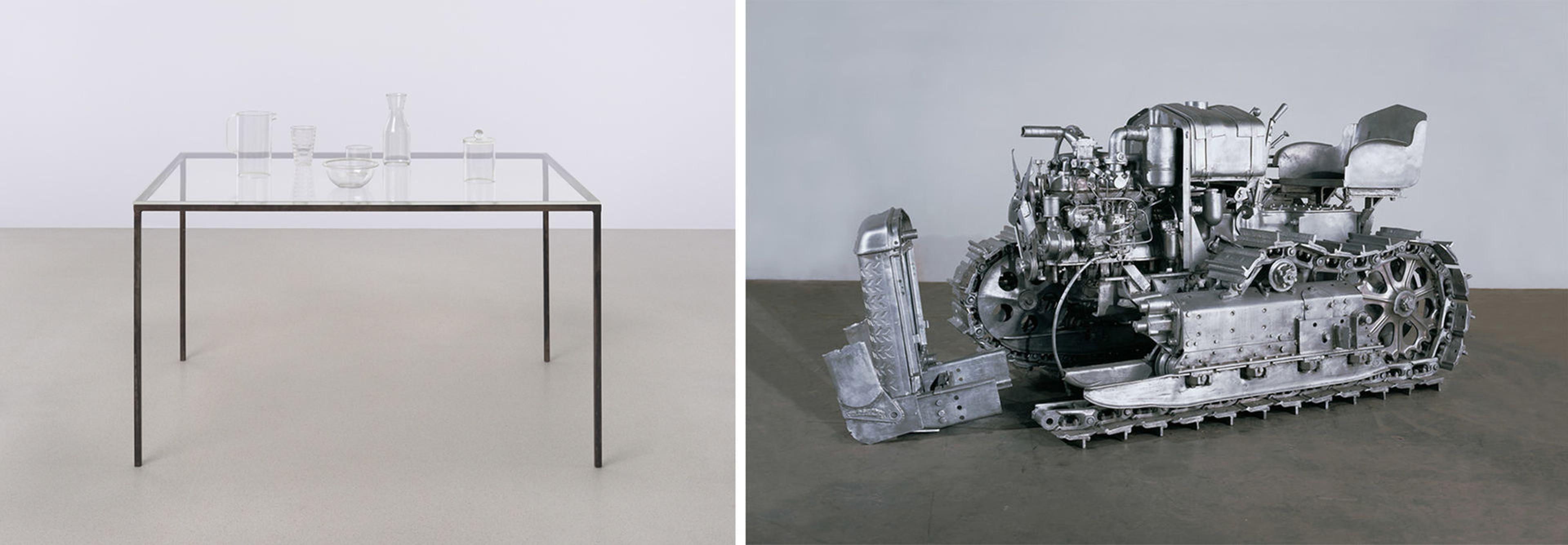 Left: Charles Ray (American, b. 1953). Table, 1990. Plexiglas and steel, 35 5/8 x 35 5/8 x 52 in. (90.5 x 89.9 x 134 cm). Collection of the artist, courtesy Matthew Marks Gallery. Right: Charles Ray (American, b. 1953). Tractor, 2005. Aluminum, 56 5/8 in. x 10 ft. x 61 in. (143.8 x 306.1 x 154.9 cm). Glenstone Museum, Potomac, Maryland. Photographs © Charles Ray, Courtesy Matthew Marks Gallery