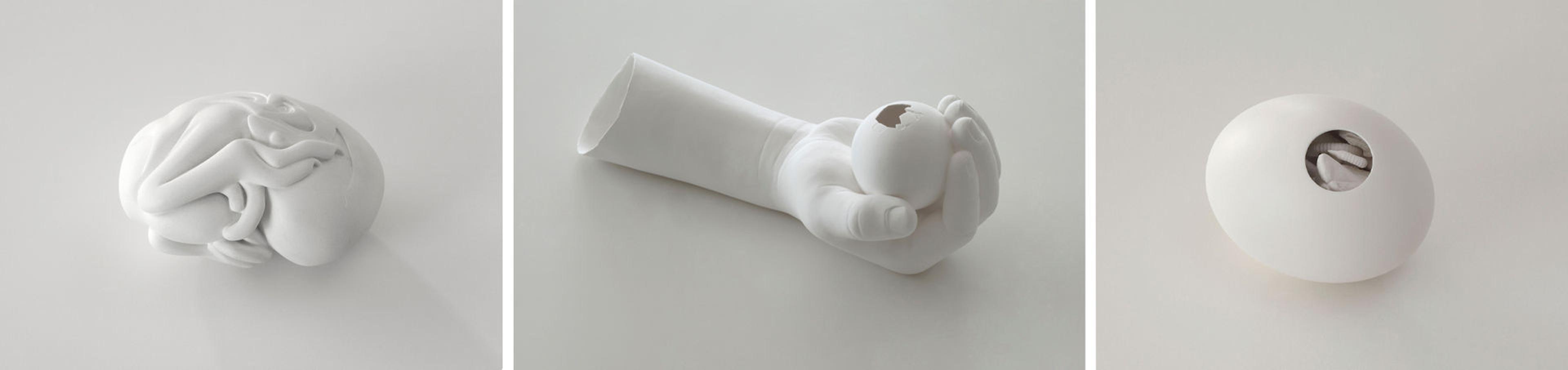 Left: Charles Ray (American, b. 1953). Handheld bird, 2006. Painted stainless steel, 2 x 4 x 3 (5.1 x 10.2 x 7.6 cm). Matthew Marks Gallery. Center: Charles Ray (American, b. 1953). Hand holding egg, 2007. Porcelain, 3 x 8 x 3 in. (7.6 x 20.3 x 9.5 cm). Matthew Marks Gallery. Right: Charles Ray (American, b. 1953). Chicken, 2007. Painted stainless steel and porcelain, 1 x 2 x 1 (4.4 x 5.7 x 4.4 cm). Glenstone Museum, Potomac, Maryland. Photographs © Charles Ray, Courtesy Matthew Marks Gallery