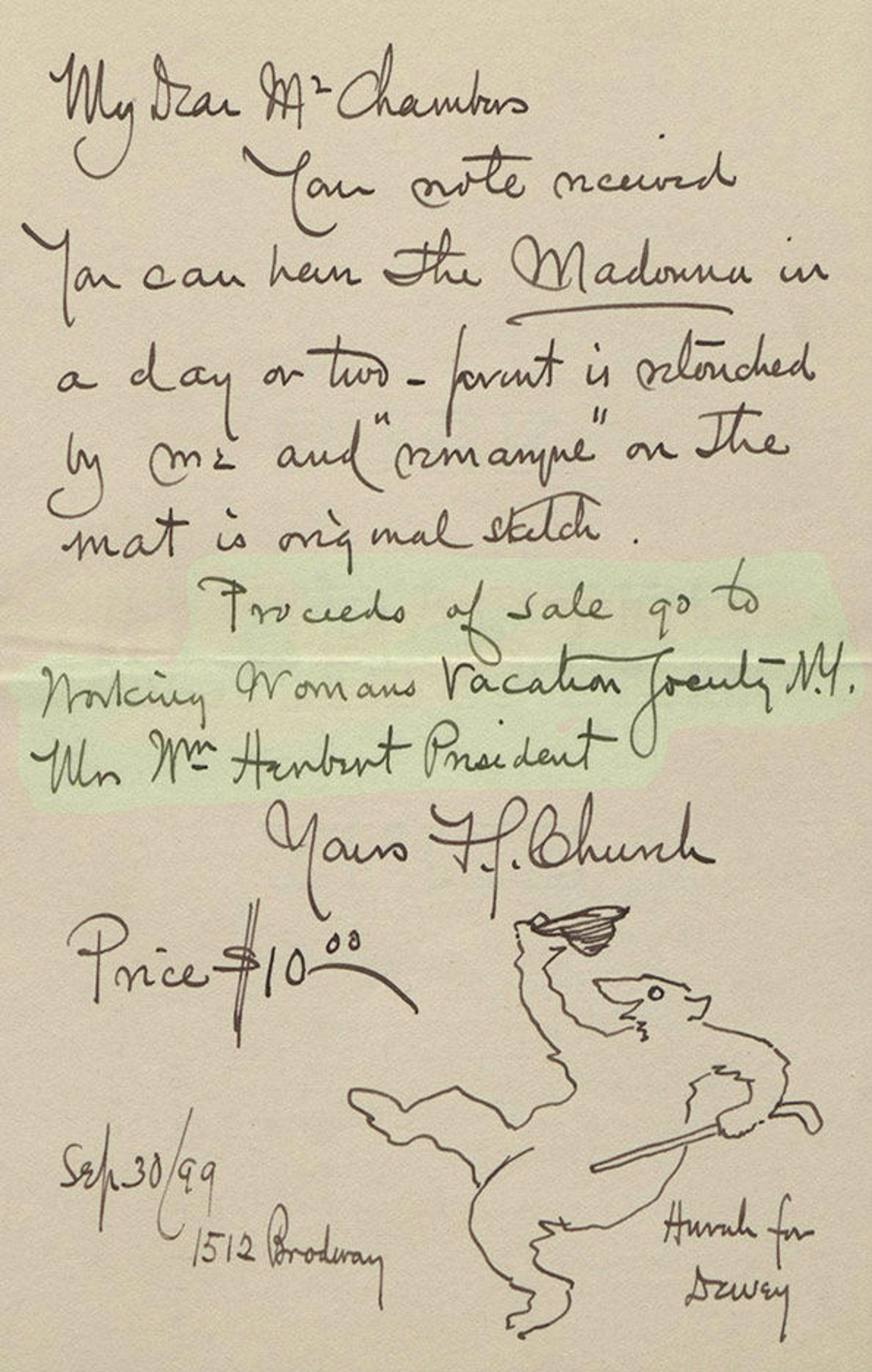 Well, as it turns out, I had gotten pretty much the entire thing wrong. Fortunately Horst was able to set me straight. What it actually says is: "The proceeds go to Working Woman's Vacation Society - N.Y." He further clarified that "Church was a supporter of women's rights, and a number of his illustrations deal with this issue." I am extremely grateful to Horst not only for helping me decipher what Church had actually written, but also for helping to contextualize the letter.