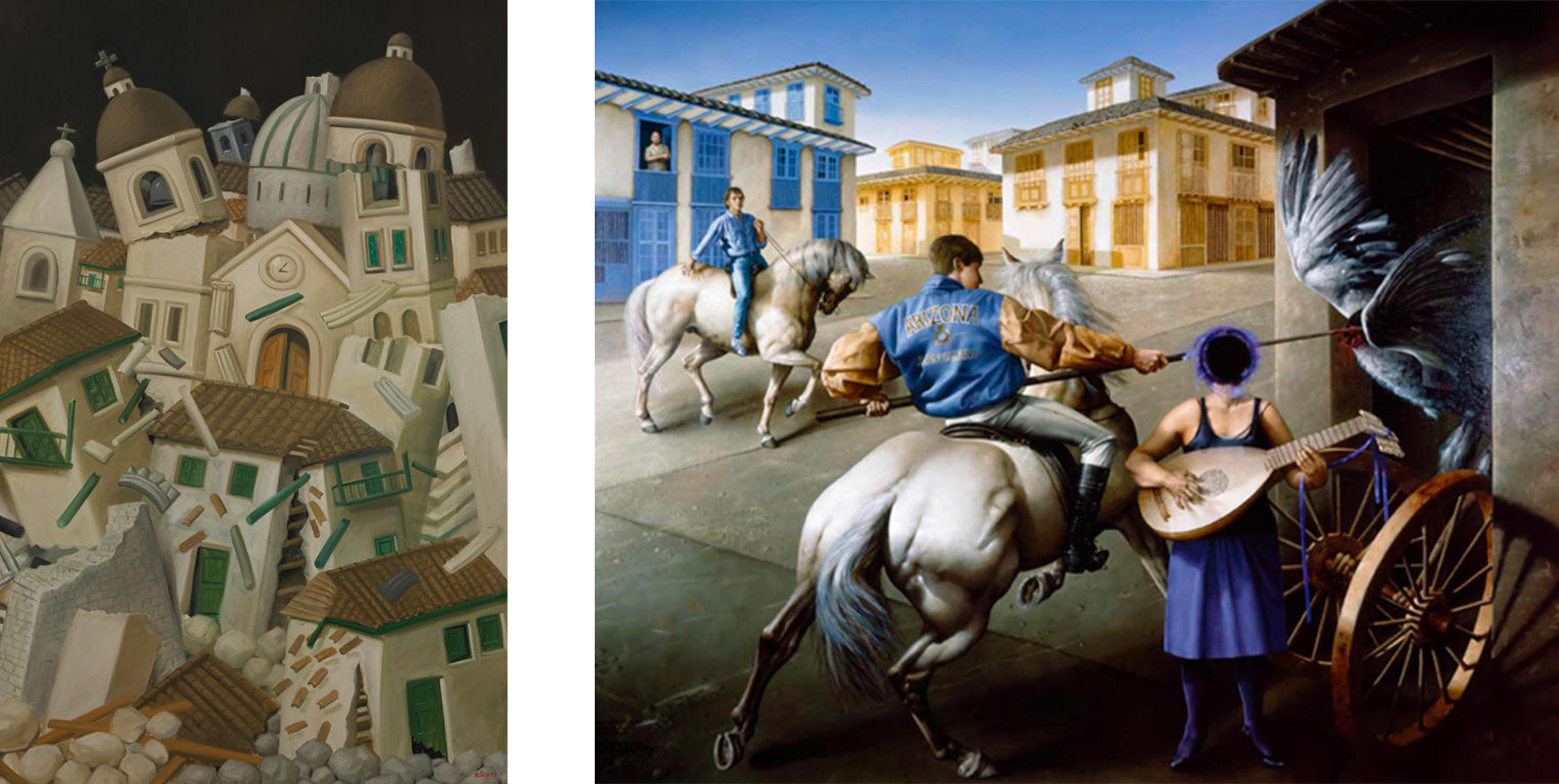 Colombia is predominantly Catholic, and in the nineteenth century small towns or pueblos flourished around a church and plaza that served as the epicenter of daily life. Botero grew up seeing churches, Baroque paintings, and polychrome sculptures. You can see these colonial vestiges in his paintings: bell towers, terracotta tile roofs, white stucco walls, and carved wooden doors. These are also prominent in the works of David Manzur, a painter known for his depictions of horses alongside Baroque and Renaissance motifs. Laced with anachronism, his work brings archetypal figures into the contemporary world.