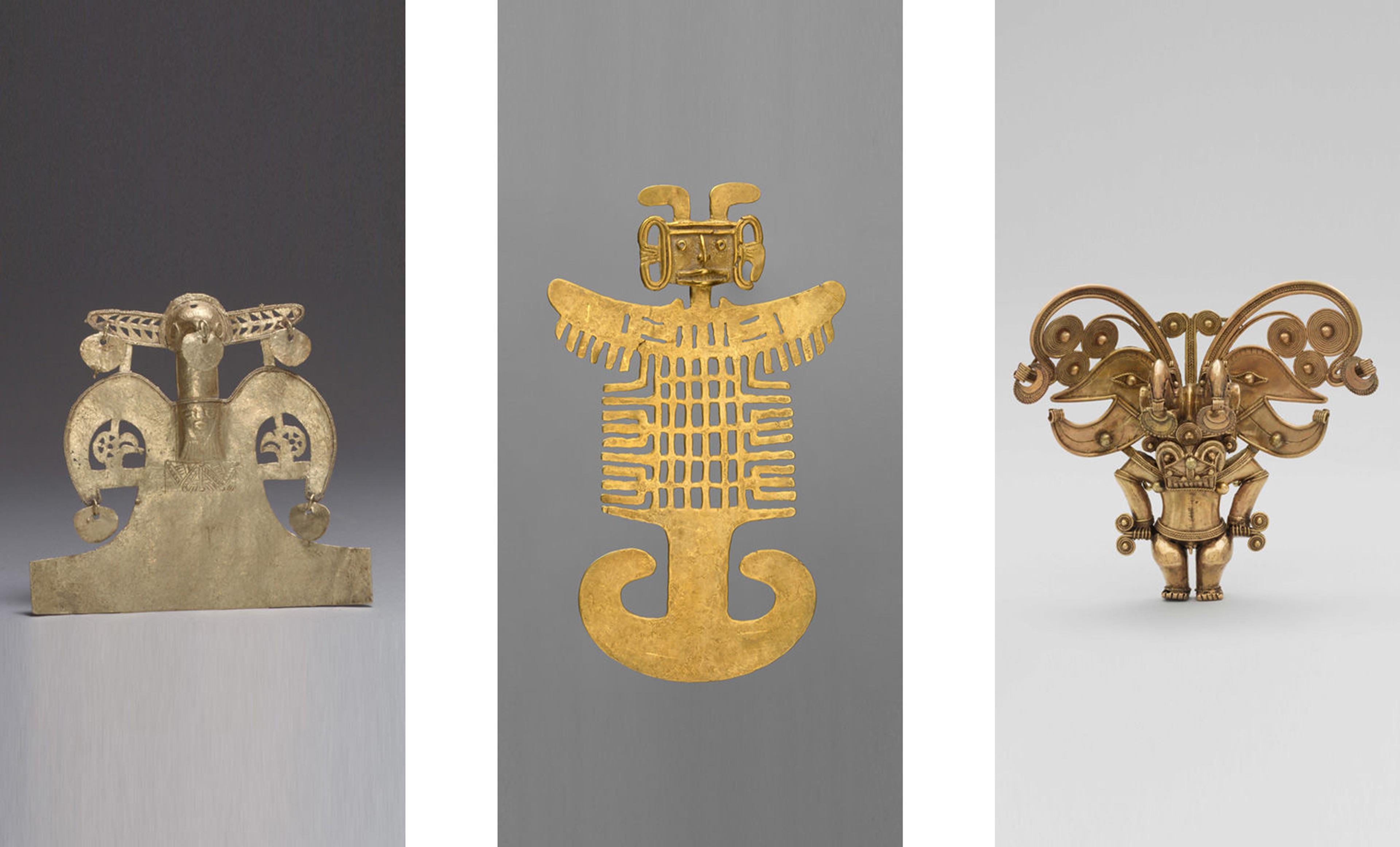 Left: Bird Pendant, 10th–16th century, Muisca. Colombia. Gold, 4 x 4 3/8 x 3/4 in. (10.2 x 11.1 x 1.9 cm). The Michael C. Rockefeller Memorial Collection, Bequest of Nelson A. Rockefeller, 1979 (1979.206.509) Middle: Costumed Figure Pendant, 1st–7th century, Tolima. Colombia. Gold, 7 × 4 3/8 × 3/8 in. (17.8 × 11.1 × 1 cm). The Michael C. Rockefeller Memorial Collection, Bequest of Nelson A. Rockefeller, 1979 (1979.206.497). Figure Pendant, 10th–16th century, Tairona. Colombia. Gold, 5 1/4 × W. 5 3/4 × D. 2 in. (13.3 × 14.6 × 5.1 cm). Jan Mitchell and Sons Collection, Gift of Jan Mitchell, 1991 (1991.419.31)