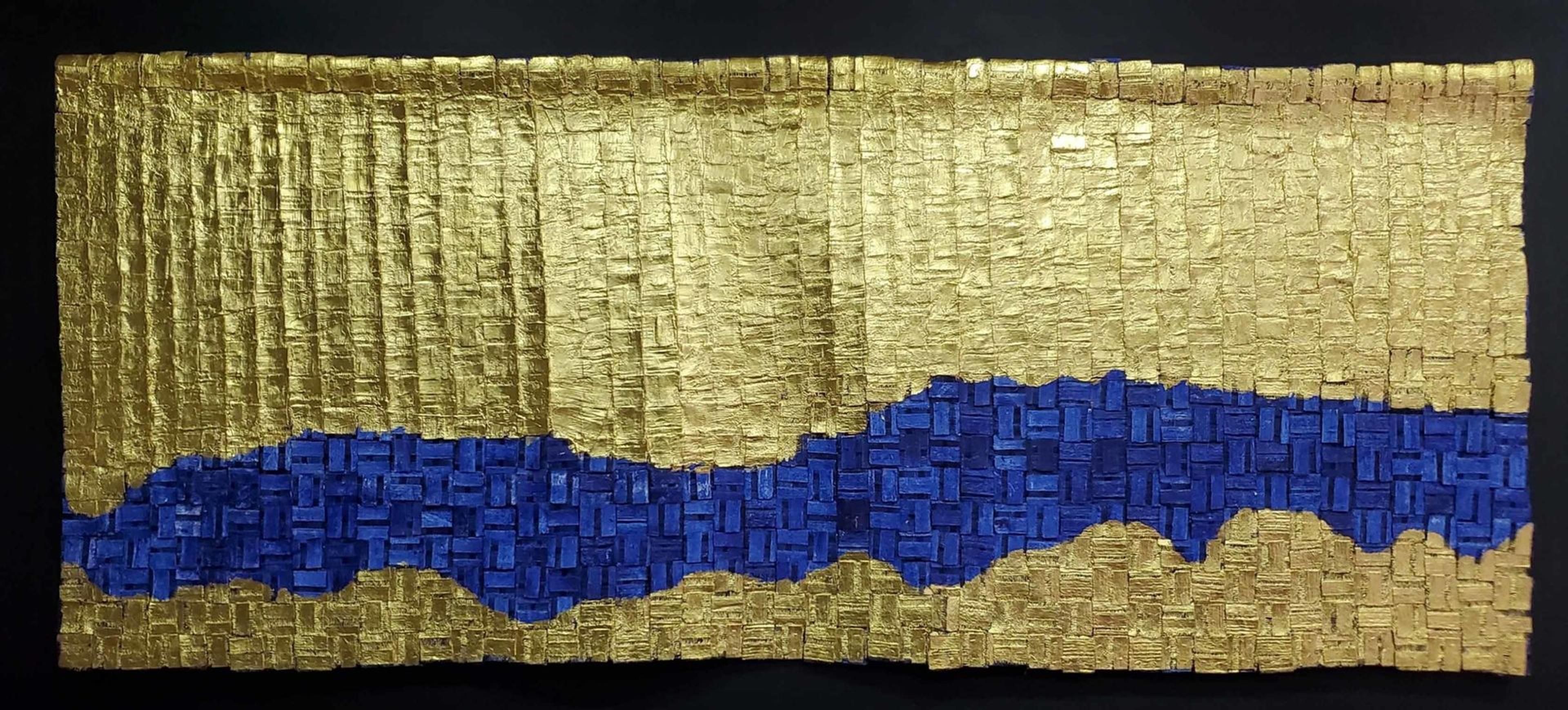 Olga de Amaral (Colombian, born 1932). Grieta azul, 2016. Linen, gesso, acrylic and gold leaf, 29 1/2 × 70 9/10 in (75 × 180 cm). Courtesy Banco de la República © Museo Botero - Banco de la República