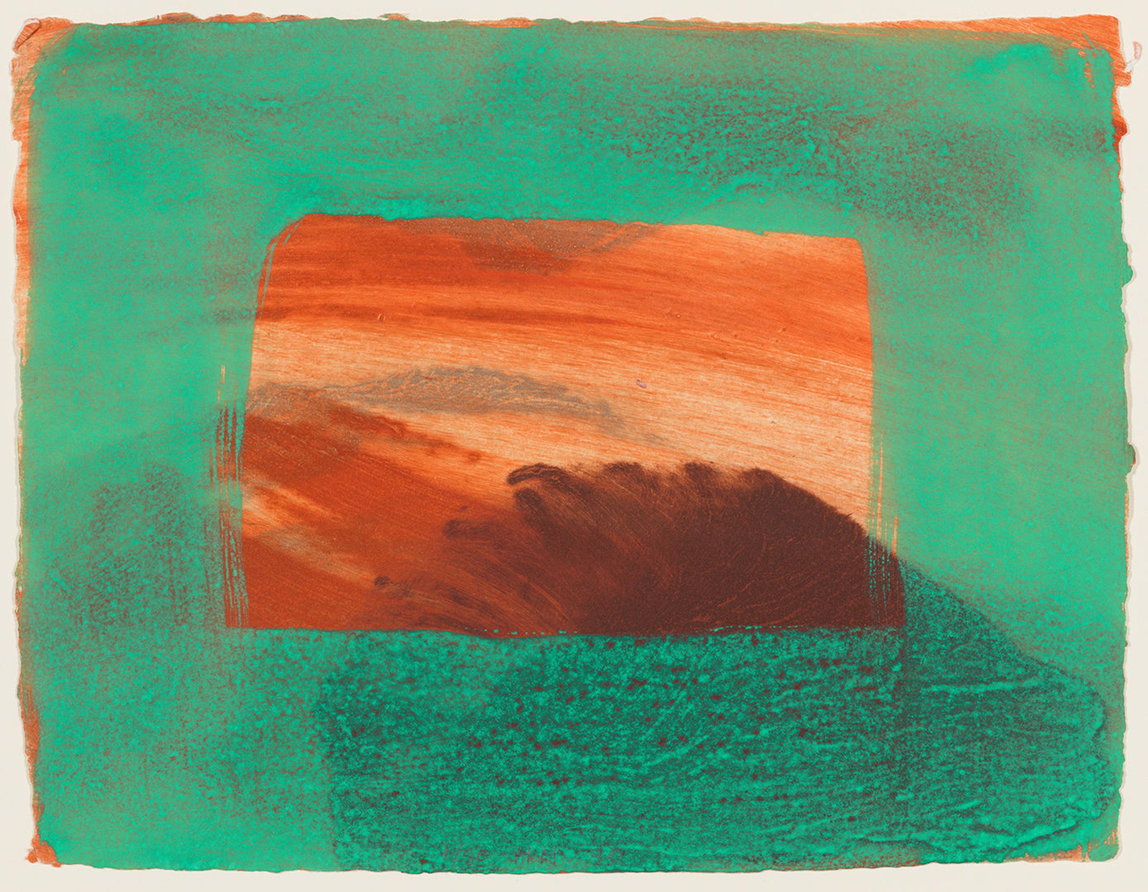Color contrasts dominate Howard Hodgkin’s (1932–2017) After Degas (1990), whose title, lush strokes, and vibrant colors evoke his memory of encountering work by the French impressionist artist Edgar Degas. For this work, Hodgkin combined intaglio printing with carborundum and hand coloring. The fluidity of the gestural marks conveys a sense of spontaneity and immediacy, effects not generally associated with intaglio printing. Carborundum, a sticky compound that adds surface texture, amplifies this sensation. Despite the autographical associations often projected onto gestural marks, it is not Hodgkin’s touch that is visible in the hand-painted sections but rather that of his printer, Jack Shirreff, who worked under Hodgkin’s close direction to create the vibrant green frame he subsequently painted on each print in the edition. This frame-within-a-frame directs attention inward to broad swaths of orange and red, where the contrasting tones produce a radiance felt throughout the surface.