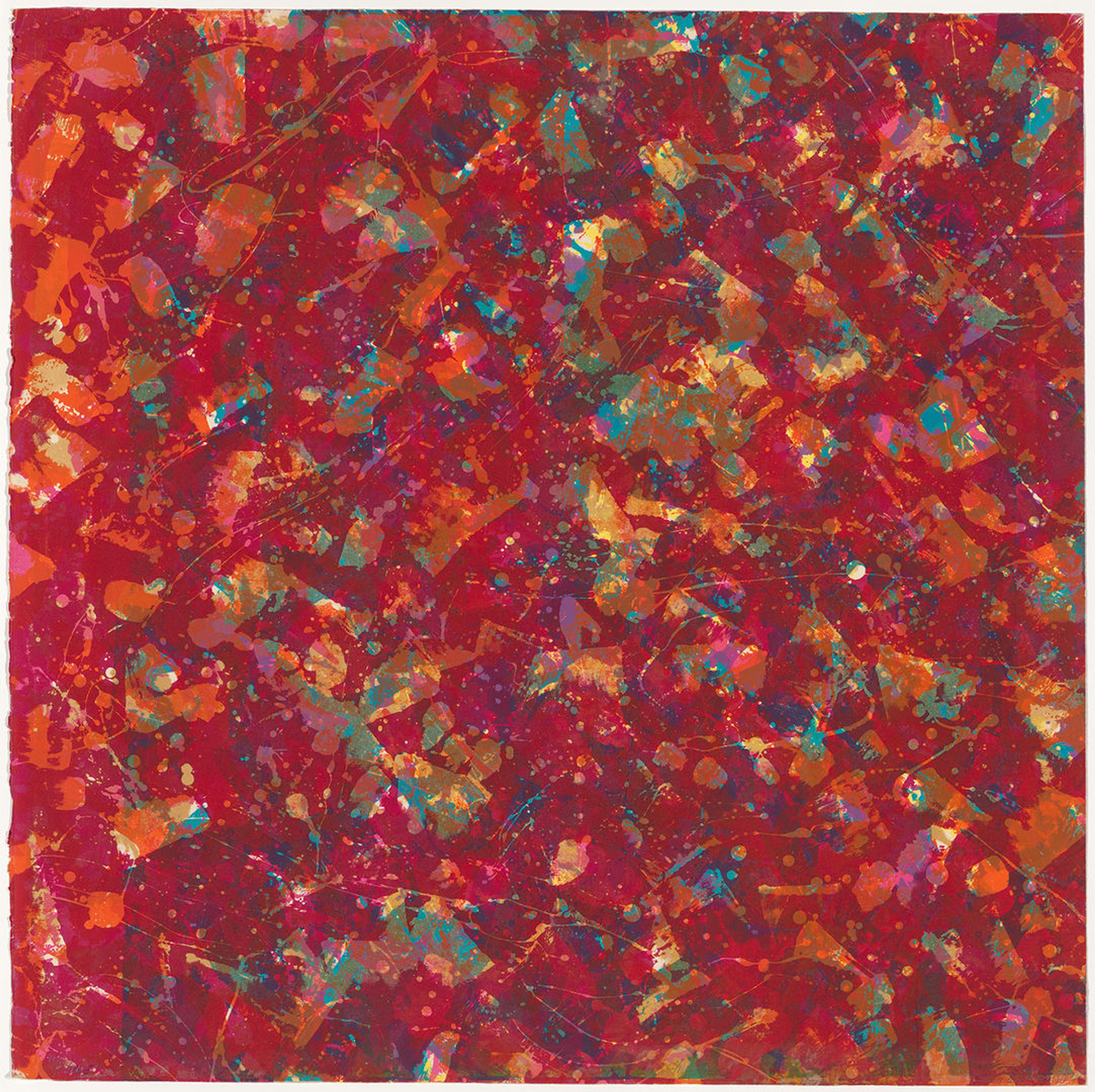 The American artist Sam Gilliam (1933–2022) stated, “I choreograph the color in terms of the way I want it to be seen.” In Phase (1974), a range of vibrant tones and fluid gestures recall drips, splatters, stains, and strokes made in paint and watercolor; here, they work in tandem to transmit an abundance of detail and emotional energy. Thick bands in lush tones of red act as a matrix for the splashes of color interspersed across the surface. Due to their various degrees of translucency, the colors appear to shimmer, mimicking the effect of dappled light and shadows created by the sun. Gilliam creates new tones through the layering of different hues, against which are irregular dabs and skeins. Phase conjures the improvisation and experimentation found in Gilliam’s monumental color-stained canvases known as the drape paintings. However, because it is a screenprint, each color, mark, and gesture had to be carefully planned, and a strict order followed in its creation. In this way, the production of the piece antithetical to the spontaneity it conveys.