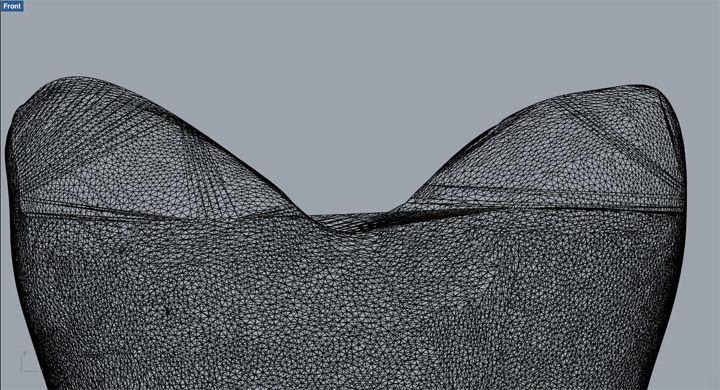When the scanner finishes capturing an object, the scans are never entirely accurate. There are "holes" where the scanner could not register the light or texture—a common occurrence when scanning textiles—and the surfaces also appear jagged and irregular. The editing process is not unlike the process of photo editing, calling for the reshaping and refining of the surface—removing imperfections on the scan to create a smooth body form.
