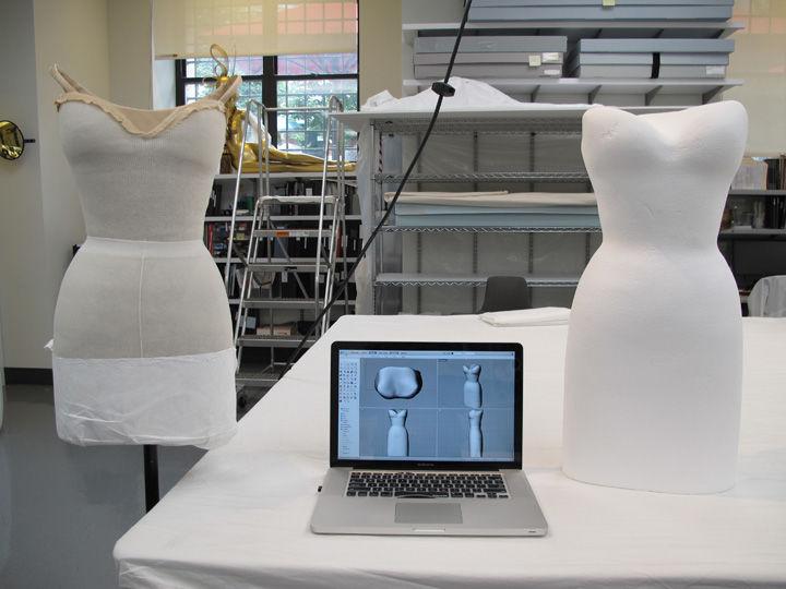 The conservators' idea was to 3D scan the forms used in the 2014 exhibition as well as James's original forms to produce replicas of the 3D models, which were carved from archival foam via CNC machine, creating a proxy for the human body to sufficiently support these dresses. Though 3D scanning has been around for decades, most scans are not as perfect and exact as the technology and media may suggest. However, scanning is rapidly becoming more accessible, more affordable, and better able to produce high-quality 3D scans.