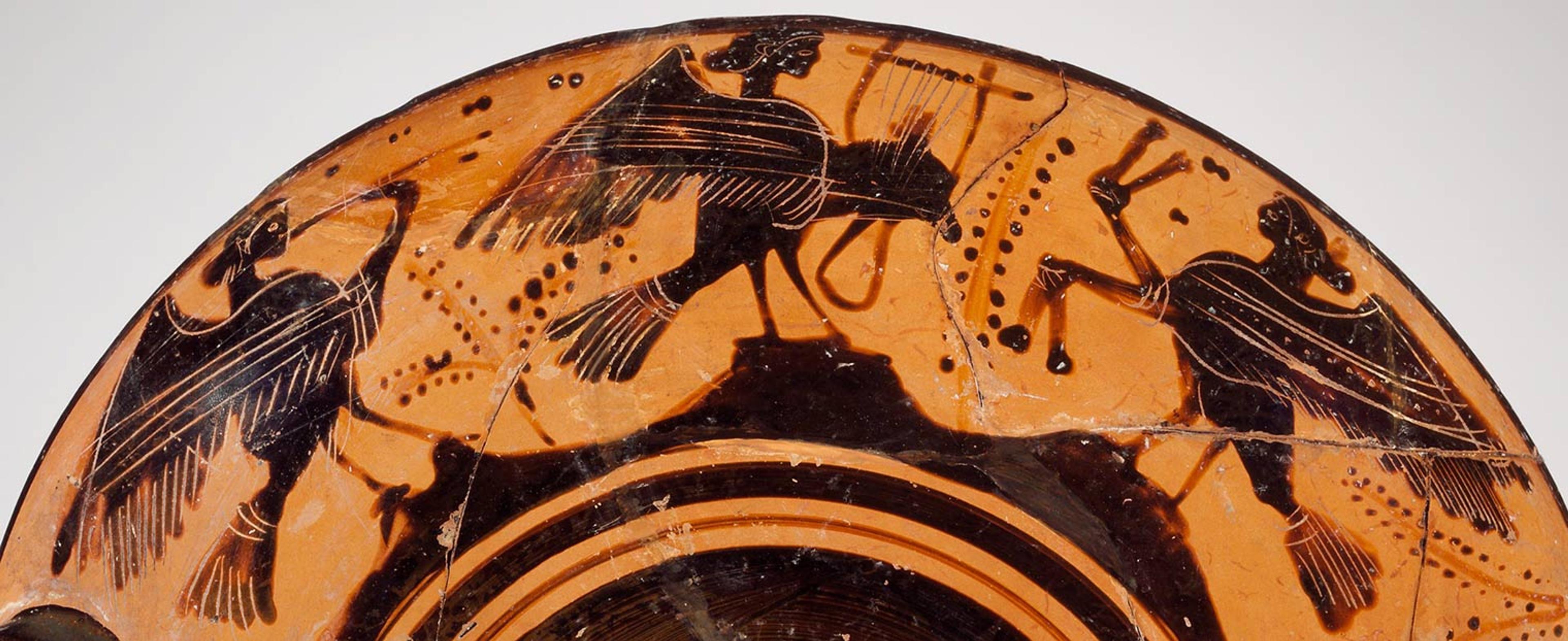 Terracotta kylix (drinking cup) (detail), early 5th century B.C. Greek (Boeotian), Classical. Terracotta; black-figure, 3 1/8 x 12in. (8 x 30.5cm); diameter 9 3/8 in. (23.7 cm). The Metropolitan Museum of Art, New York, Gift of Ernest Brummer, 1957 (57.12.5)