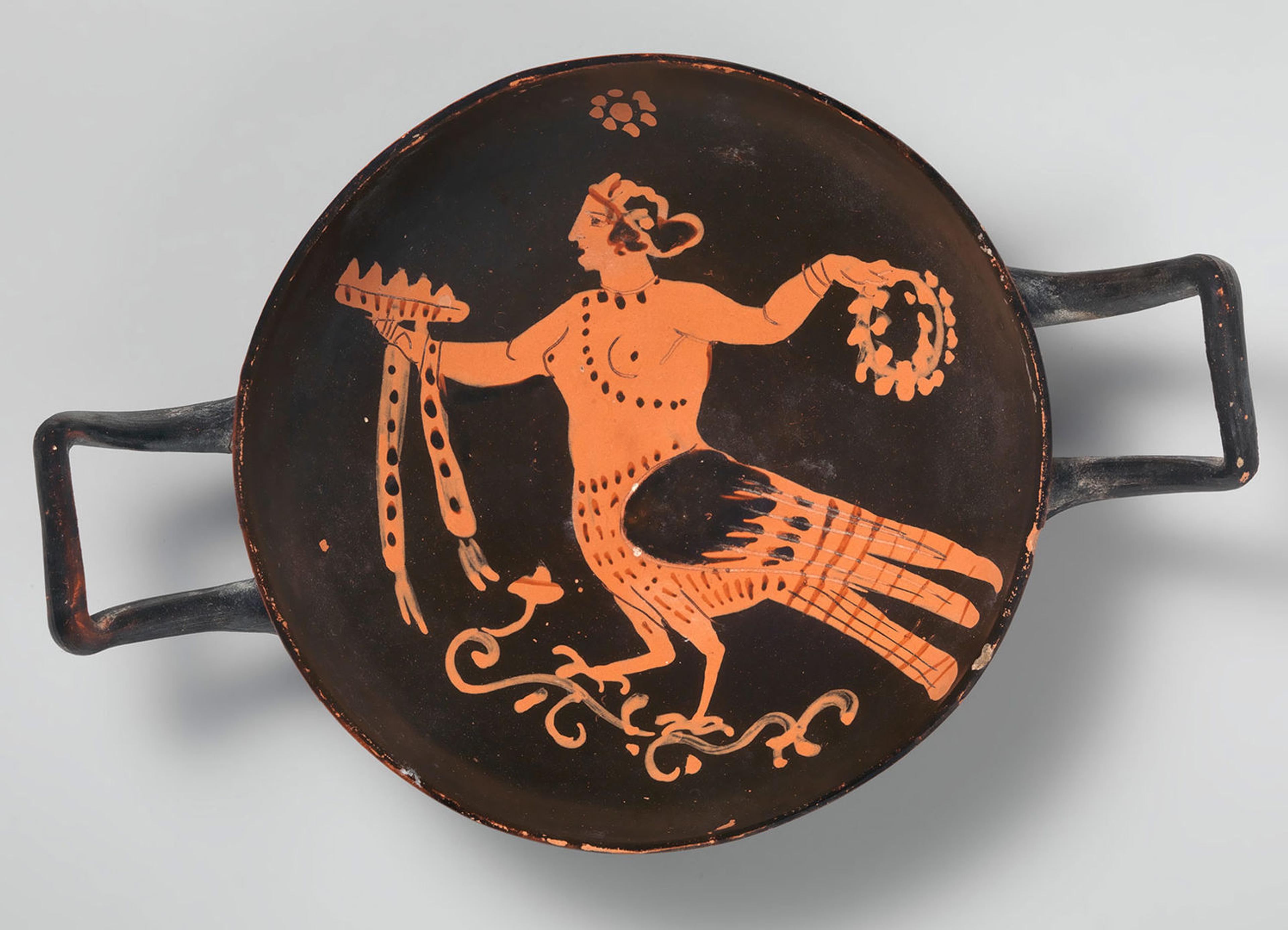 In early archaic Greek art we see the siren as a bird with a human face, but as time goes on, the sirens get more and more human and feminine. In the late archaic period they are portrayed as female musicians. They develop arms, which are essential to play music. There's a cup in the show that depicts the sirens playing instruments [above].