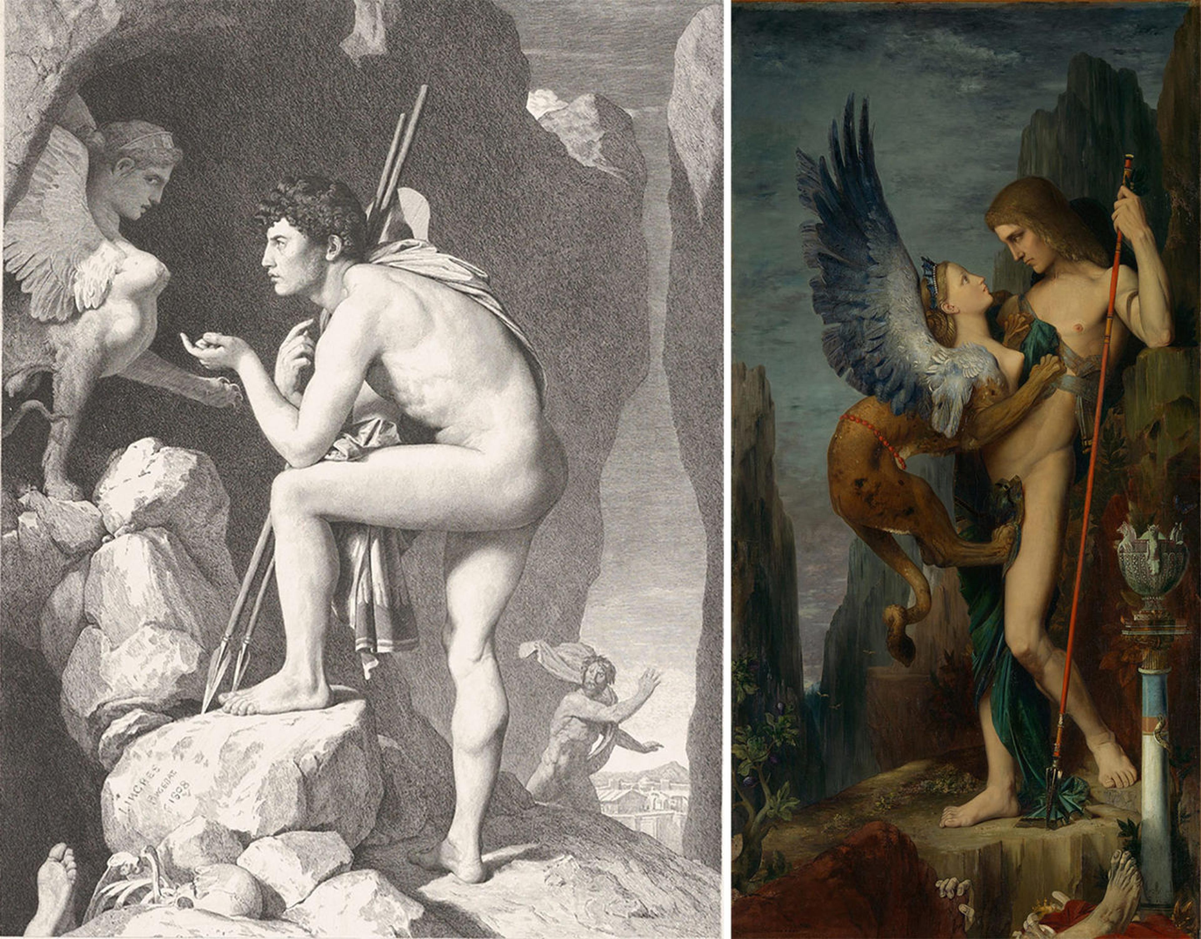 Left: Claude-Ferdinand Gaillard (French, 1834–1887). Oedipus and the Sphinx, after Ingres. Etching on heavy wove paper, sheet: 19 3/8 x 12 3/8 in. (49 x 31.5 cm); plate: 10 1/8 x 7 1/8 in. (25.6 x 18 cm). The Metropolitan Museum of Art, New York, Bequest of Phyllis Massar, 2011 (2012.136.485). Right: Gustave Moreau (French, 1826–1898). Oedipus and the Sphinx, 1864. Oil on canvas, 81 1/4 x 41 1/4 in. (206.4 x 104.8 cm). The Metropolitan Museum of Art, New York, Bequest of William H. Herriman, 1920 (21.134.1)