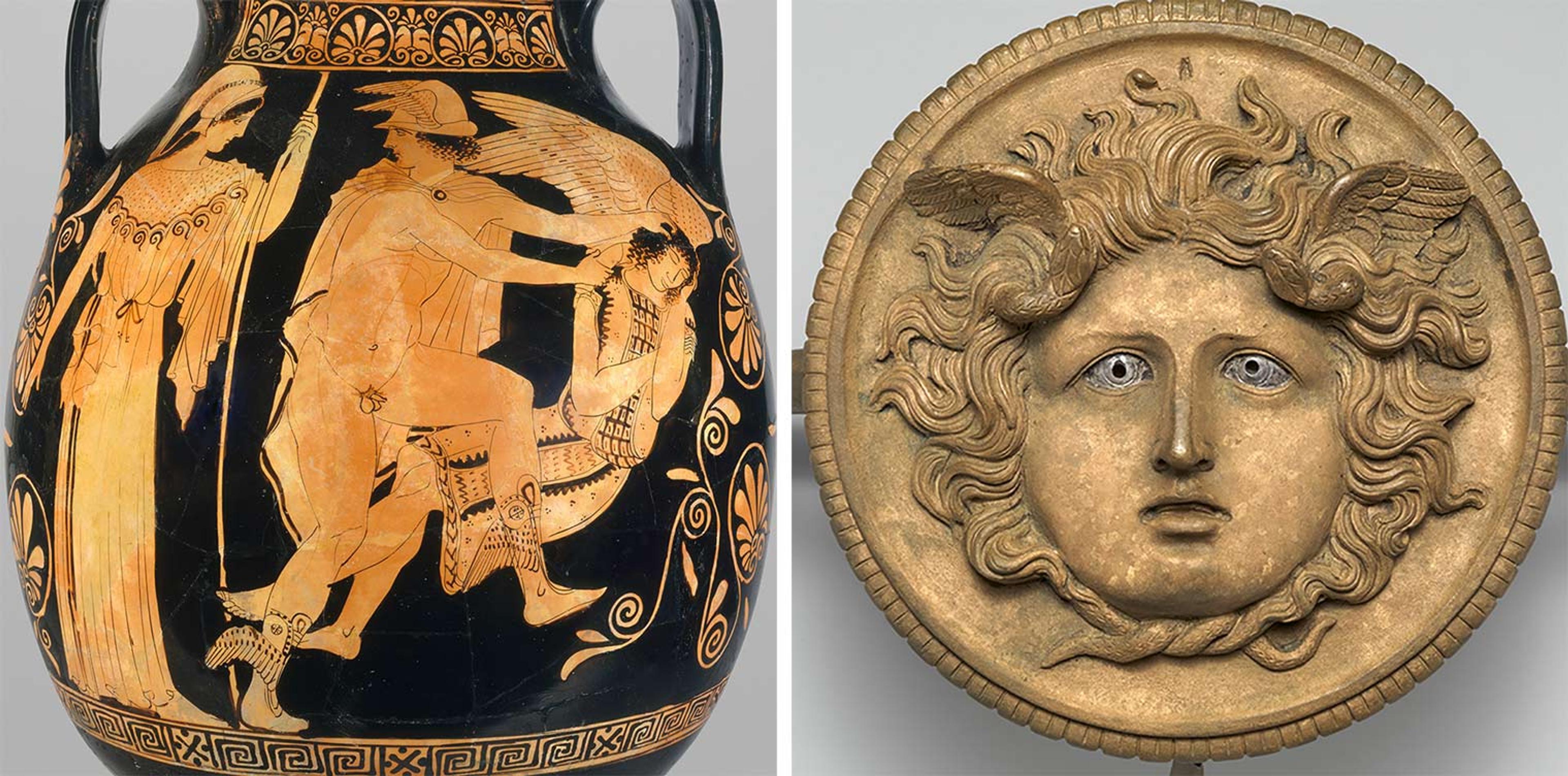 Left: Pelike (jar) with Perseus beheading the sleeping Medusa, ca. 450–440 B.C. Attributed to Polygnotos. Greek (Attic), Classical. Terracotta; red figure, H. 18 7/8 in (47.8 cm); diameter 13 1/2 in. (34.3 cm). The Metropolitan Museum of Art, New York, Rogers Fund, 1945 (45.11.1). Right: Chariot-pole finial with the head of Medusa, 1st–2nd century A.D. Roman, Imperial. Bronze, silver, copper, 7 1/4 x 7 1/8 x 4 1/4 in. (18.3 x 17.9 x 10.7 cm). The Metropolitan Museum of Art, New York, Rogers Fund, 1918 (18.75)