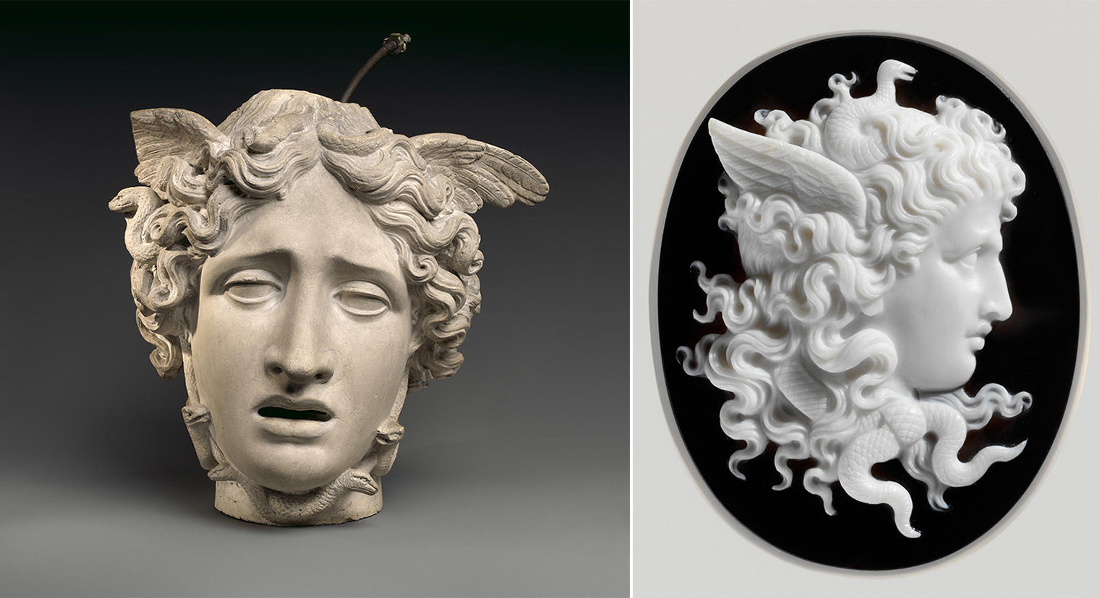Left: Plaster cast of head of Medusa, after Canova, 1806–7. Studio of Antonio Canova (Italian, 1757–1822). Italy, Rome. Plaster cast, with modern metal rod, H: 12 1/4 in. (31.1 cm). The Metropolitan Museum of Art, New York, Fletcher Fund, 1967 (67.110.2). Right: Cameo with head of Medusa, ca. 1860–70. Italy, Rome. Onyx, 1 7/8 x 1 1/2 in. (4.8 x 3.8 cm). The Metropolitan Museum of Art, New York, The Milton Weil Collection, 1940 (40.20.52)